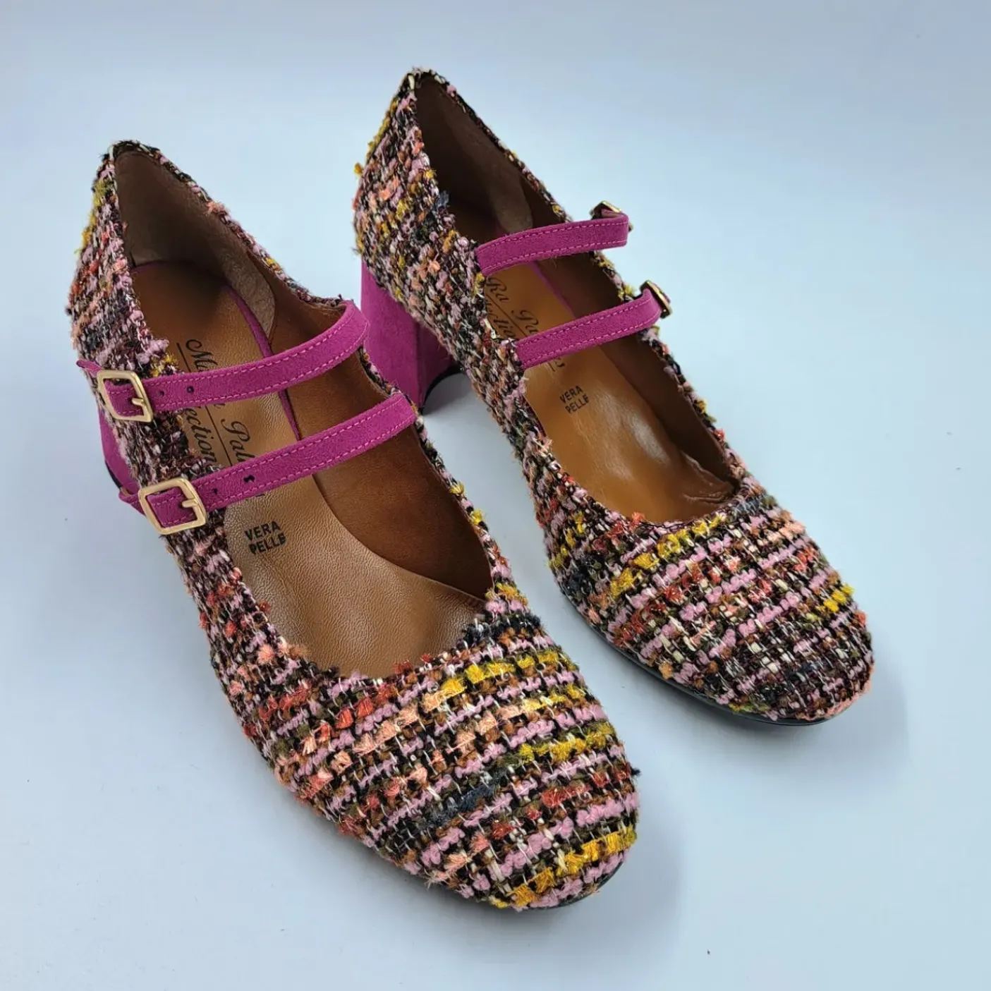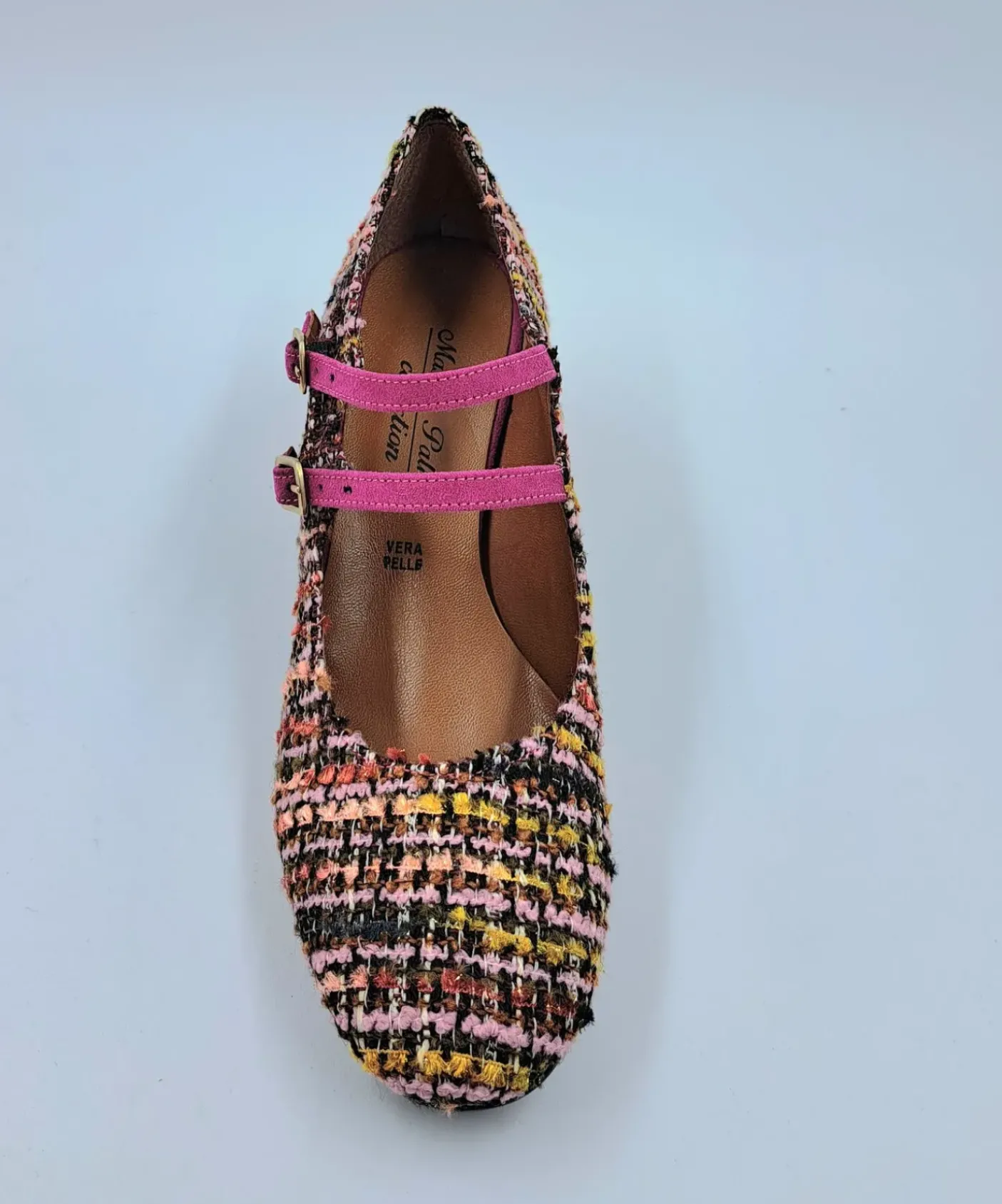 Ballerine in tessuto multi color, chiusura doppia fibbia regolabile fuxia. Rivestita internamente in pelle. Tacco rivestito in tessuto fuxia. Tacco 5cm.