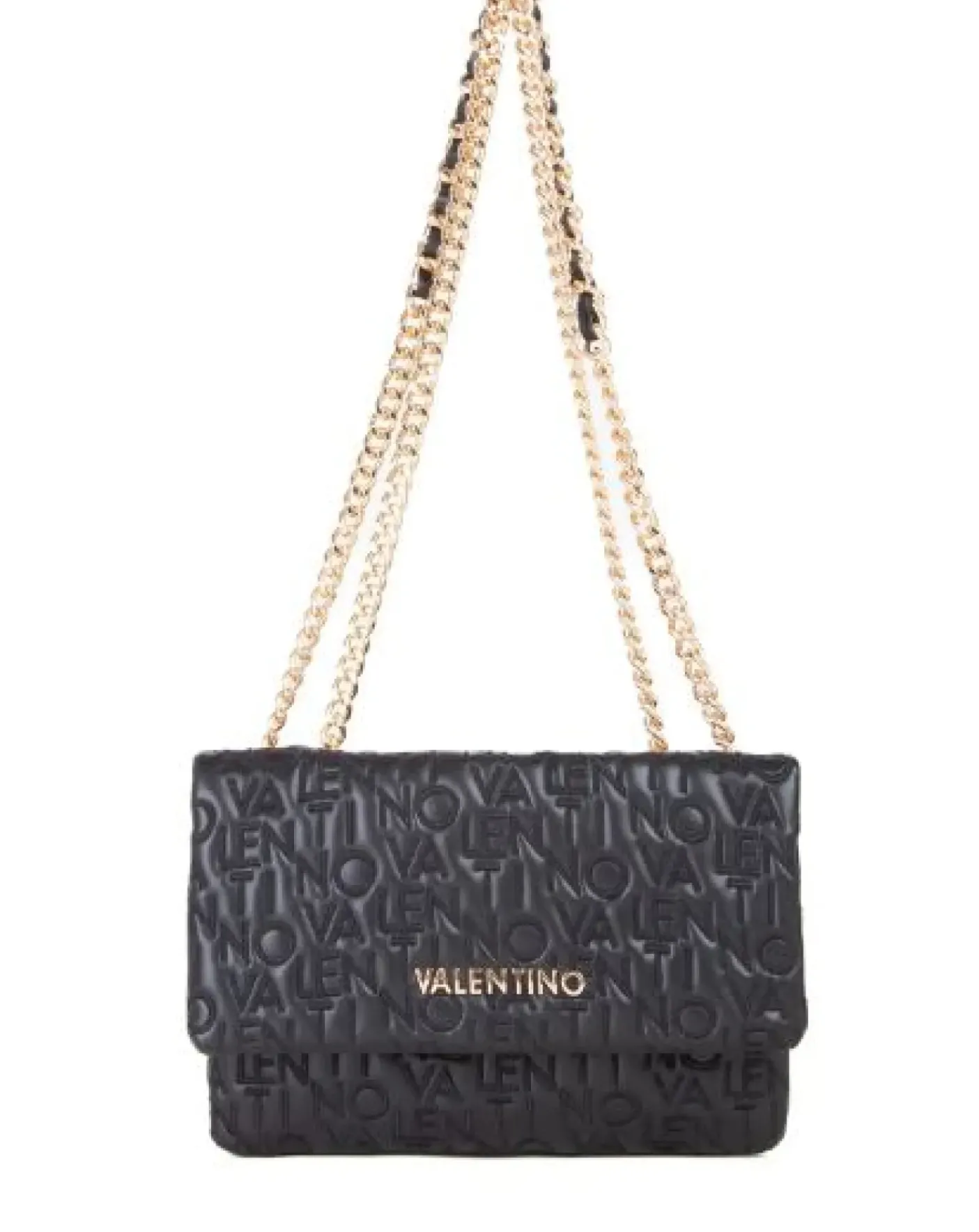 Borsa a spalla in ecopelle logo all over. Tasca interna portaoggetti. Logo frontale metallo frontale. Chiusura con patta. Tracolla catena metallo e inserti ecopelle, allungabile per trasformarla in tracolla.