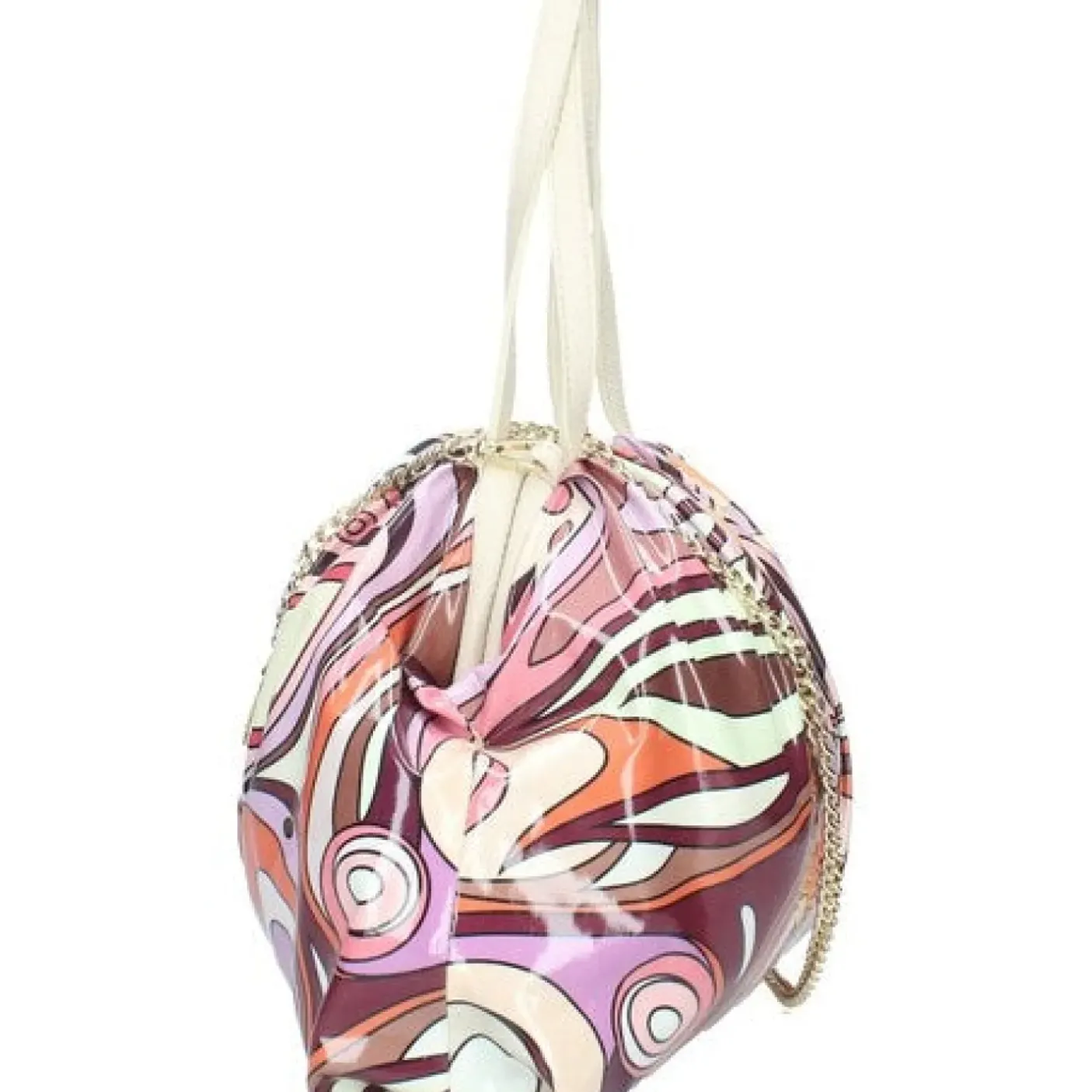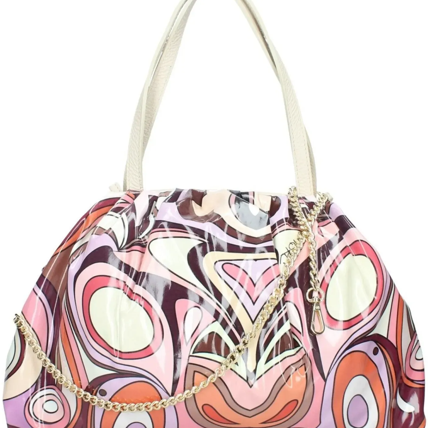 Borsa in pelle lucida multicolor, con manici in pelle e tracolla amovibile in catena color oro. Chiusura magnetica, interno con fodera e con una tasca con zip Esterno a fantasia