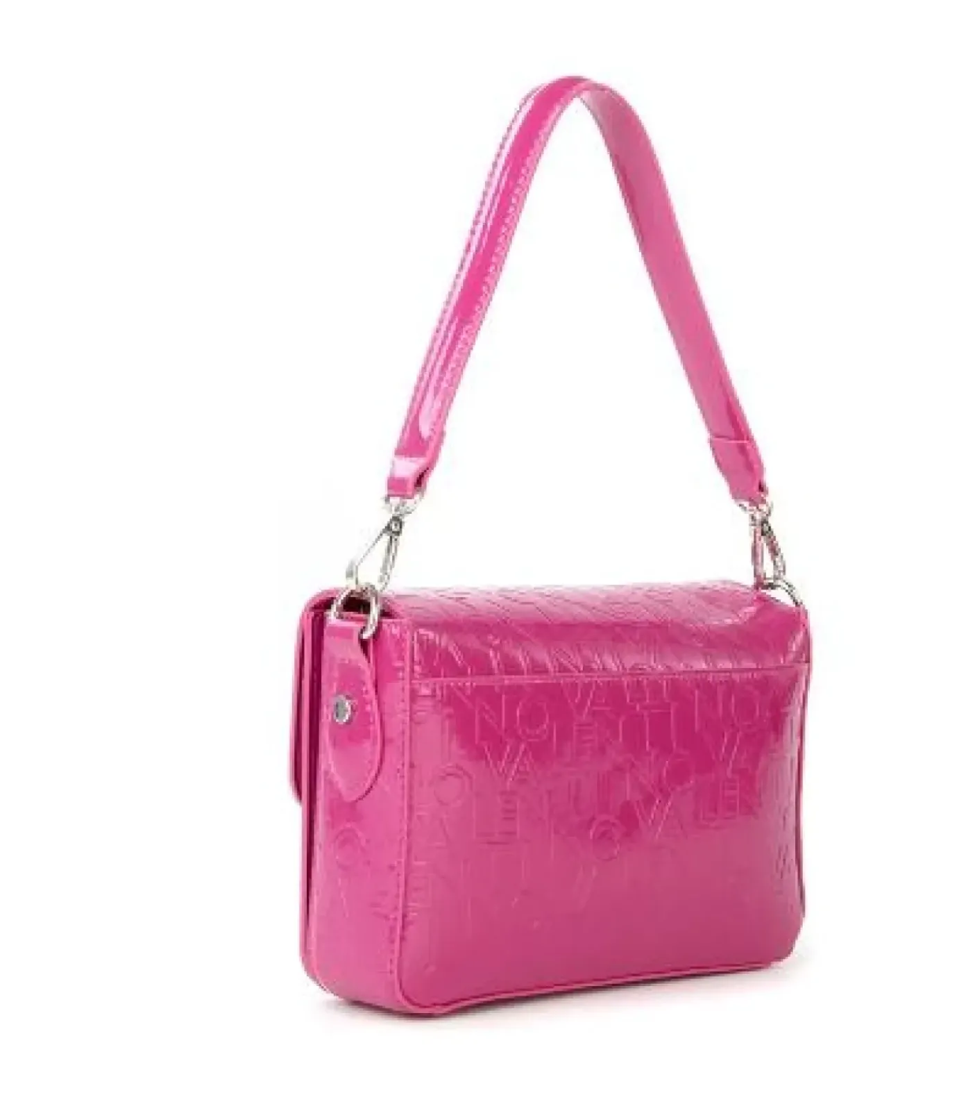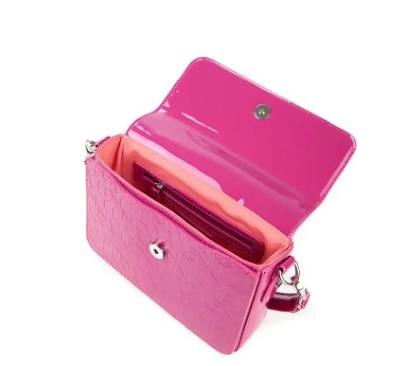 Pattina in ecopelle vernice con maxi stampa all over su tutta la borsa. Rivestita internamente in tessuto logato. Tasca con zip. Chiusura con patta e bottoni clip. Tracolla in ecopelle e tracolla in tessuto logato regolabile con ganci.