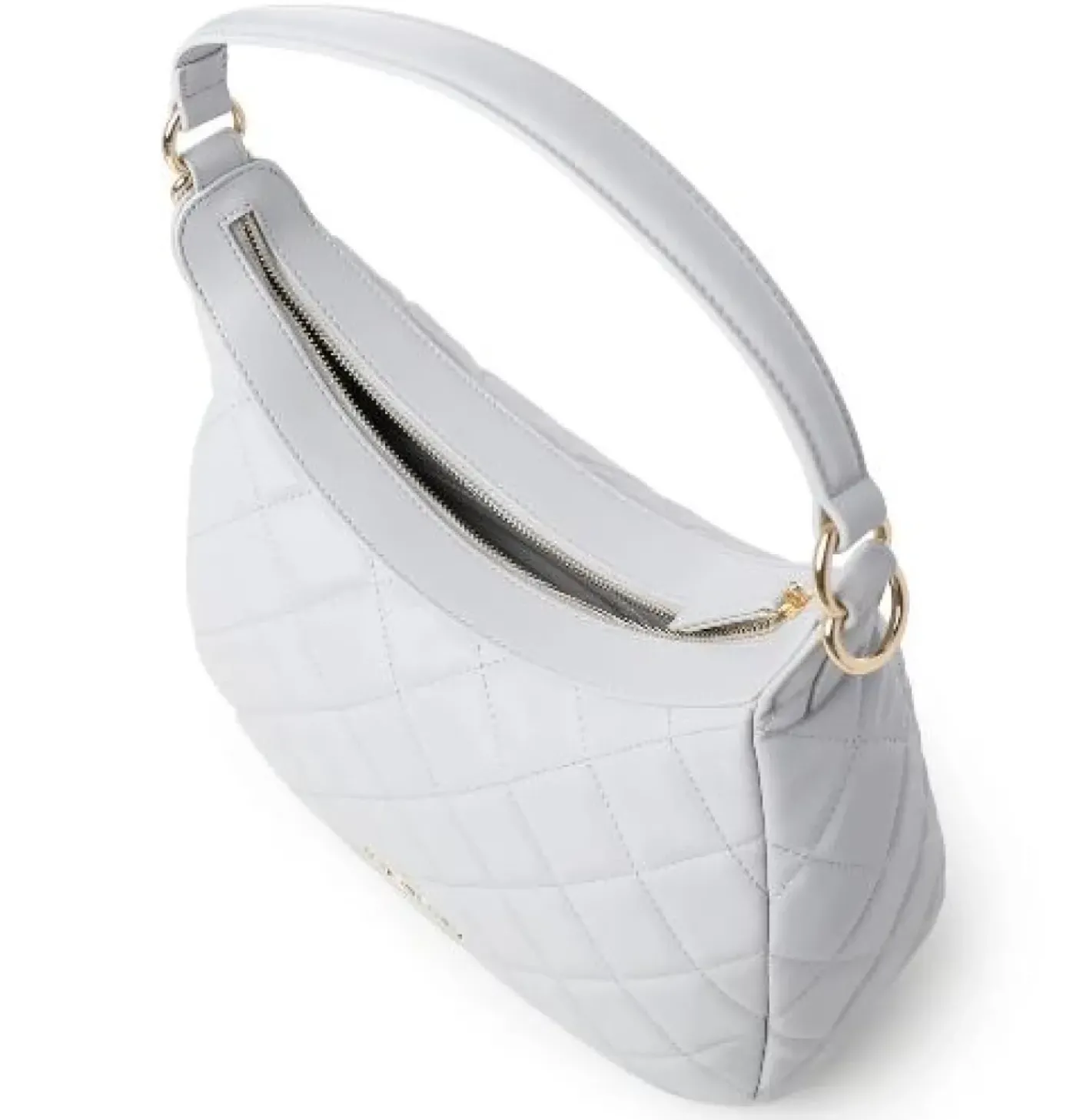 Borsa in ecopelle forma hobo lavorazione trapuntata. Rivestita internamente di tessuto logato. Tasca interna con zip. Tracolla asportabile regolabile. Chiusura con zip.