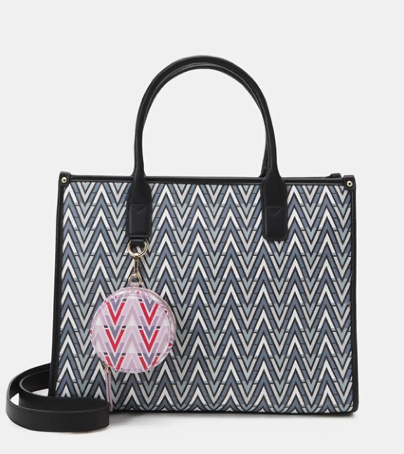 Borsa in ecopelle bordata ecopelle nera con stampa geometrica bianco, celeste e blu. Due manici tubolari, chiusura con zip. Borsellino a contrasto asportabile. Tracolla regolabile. tasca interna con zip