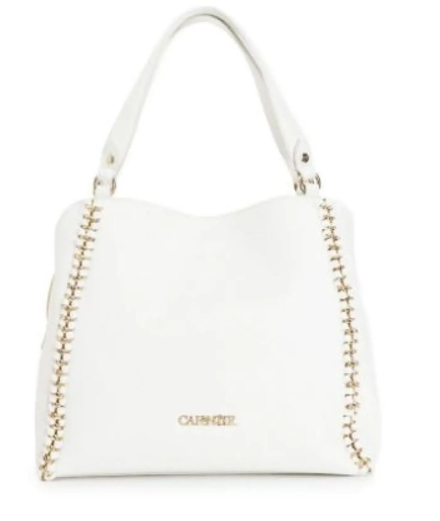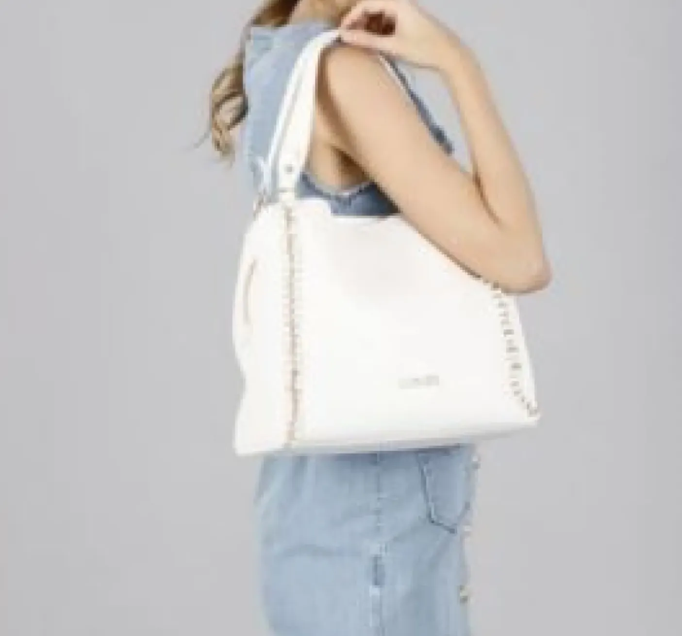Borsa shopping in ecopelle con effetto martellato, decorazione laterale con catena ed infilatura. Chiusura magnetica automatica e chiusura centrale con zip. Doppi manici in ecopelle.