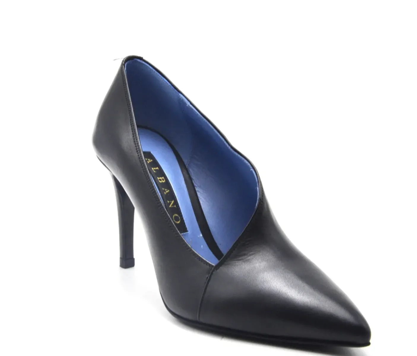 Decolletè in vera pelle rivestito internamente in pelle colore celeste. Aperto sul lato. Tacco 7cm.