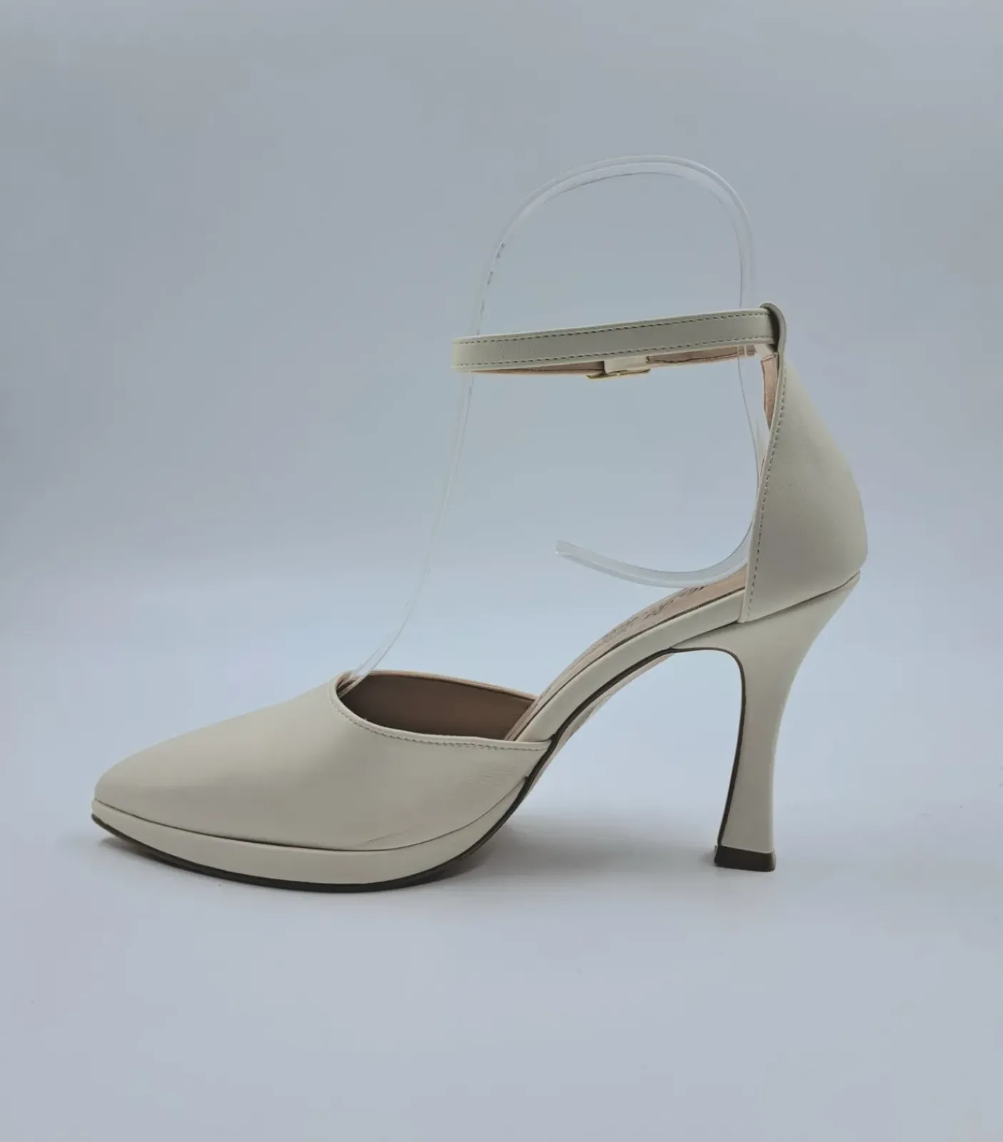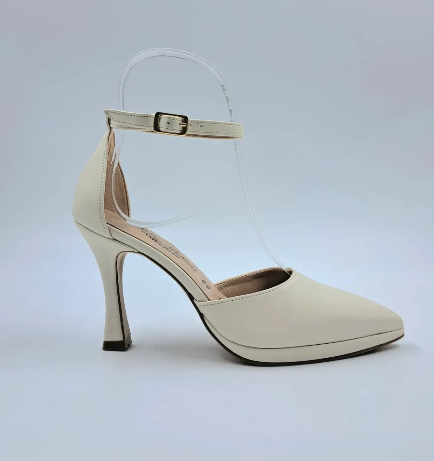 Decollete in ecopelle con cinturino regolabile alla caviglia. Rivestita internamente in pelle. Soletta in vera pelle e leggero memory form. Tacco a rocchetto 9.5 cm, plateau 1cm.