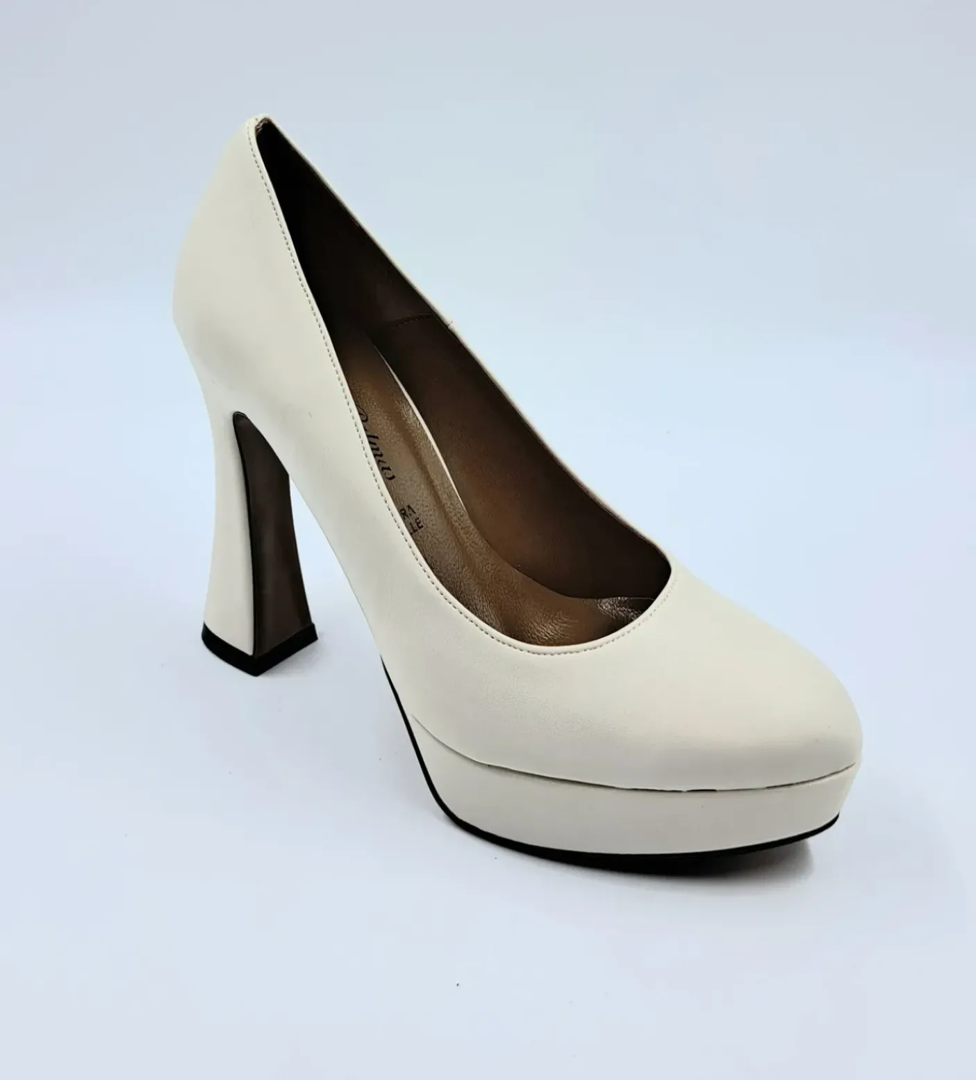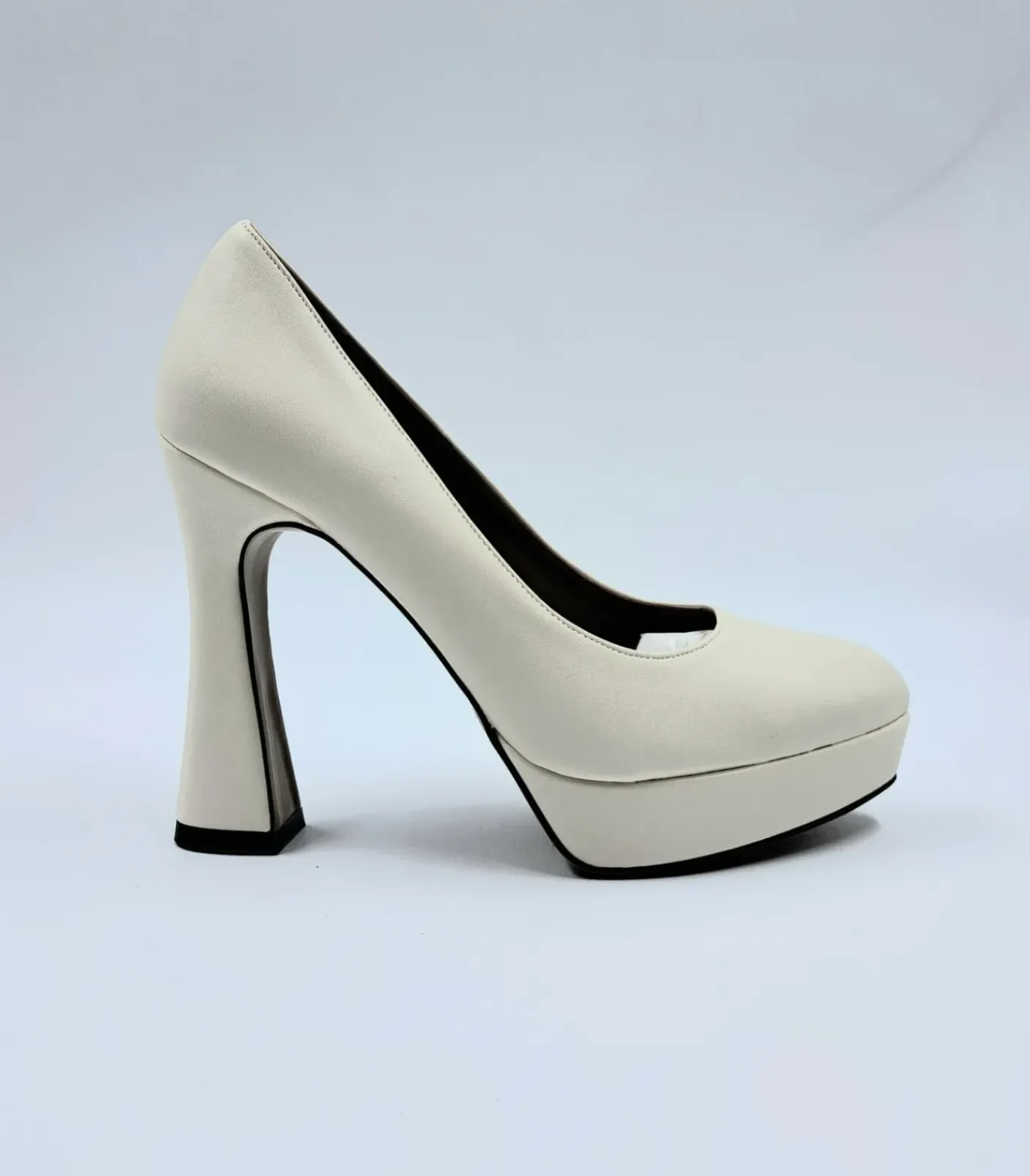 Decolleté in ecopelle rivestita internamente in pelle. Punta affusolata. Tacco squadrato 11.5 cm e plateau 2.5cm