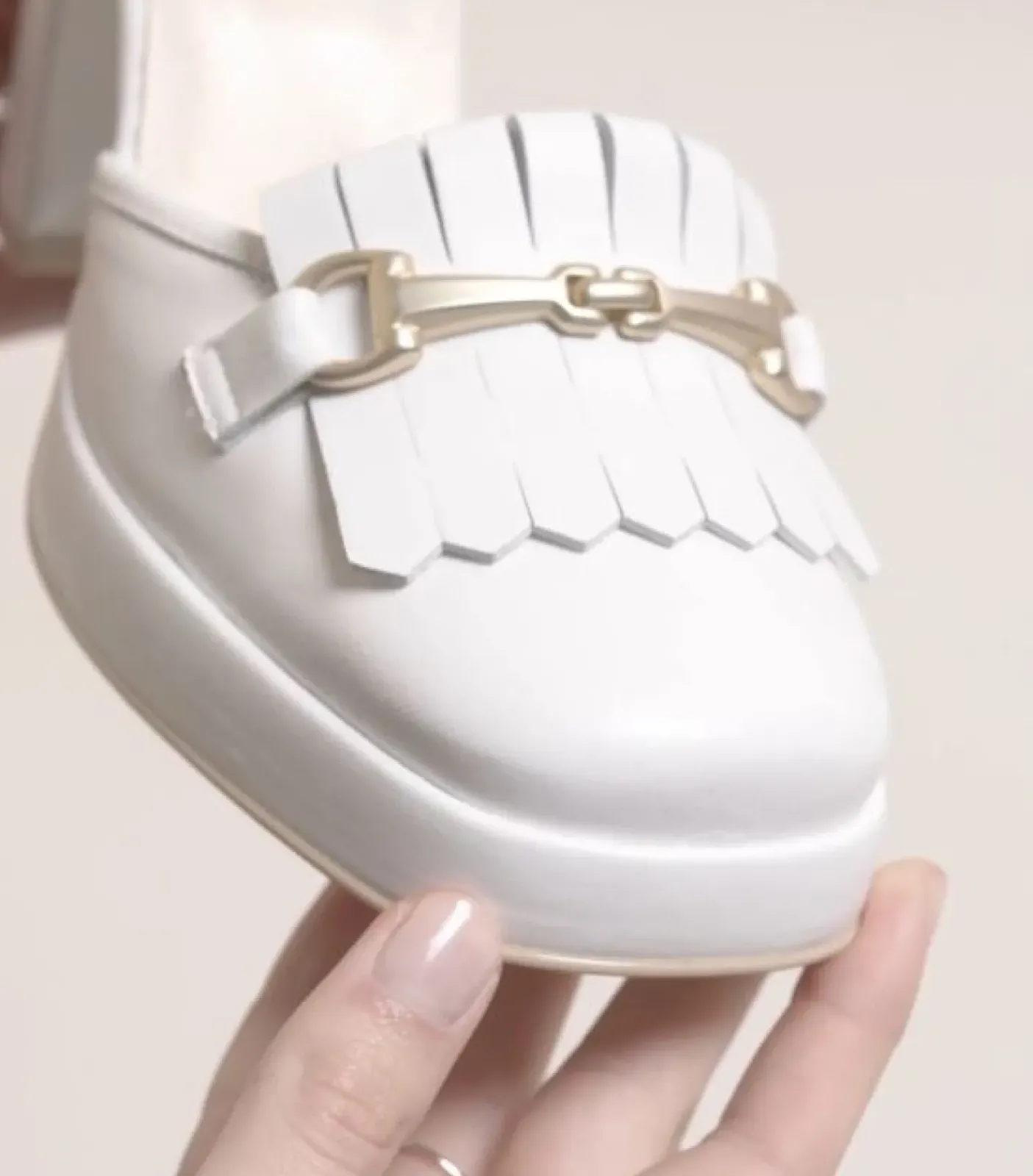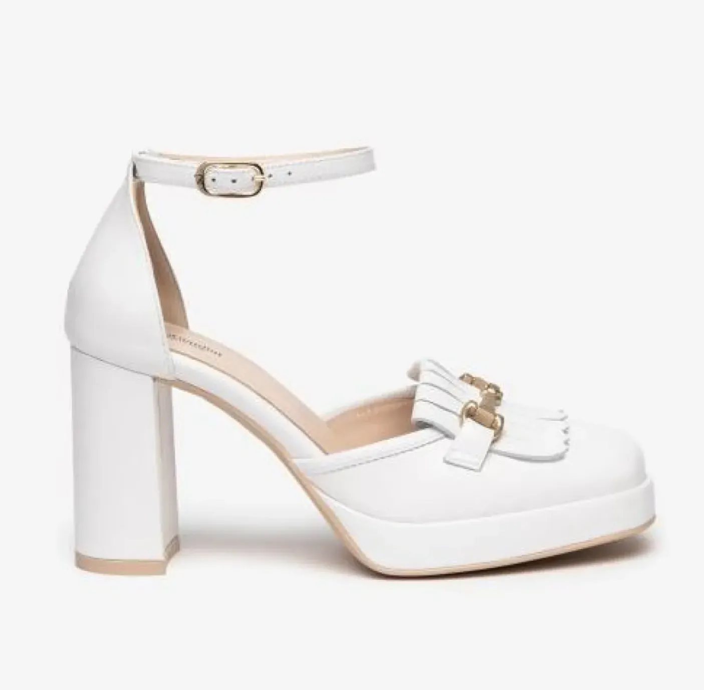 Decollette in pelle bianca con cinturino alla caviglie, Rivestito internamente in pelle. Decorazione con frange in pelle e fibbia metallica. Tacco a blocco 9 cm.