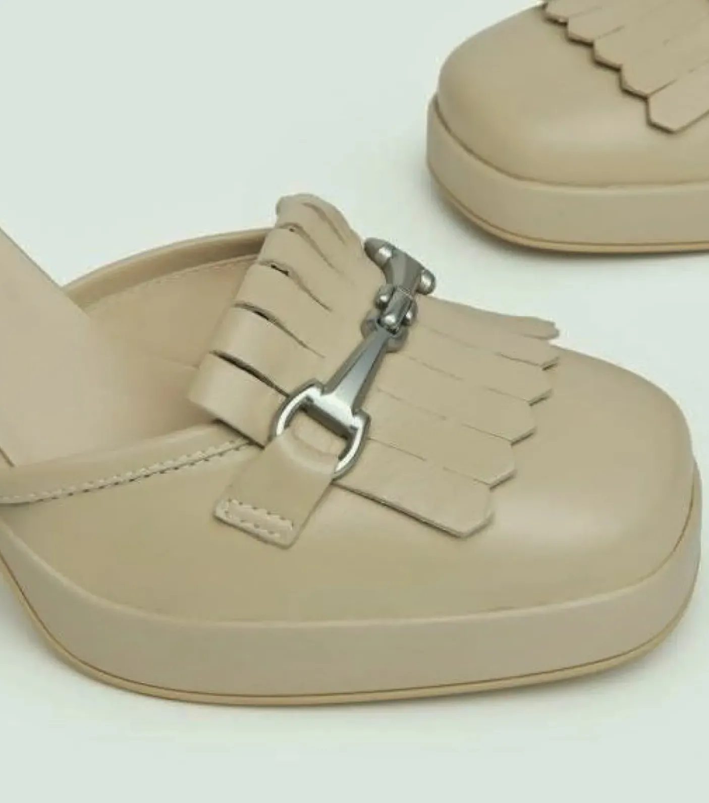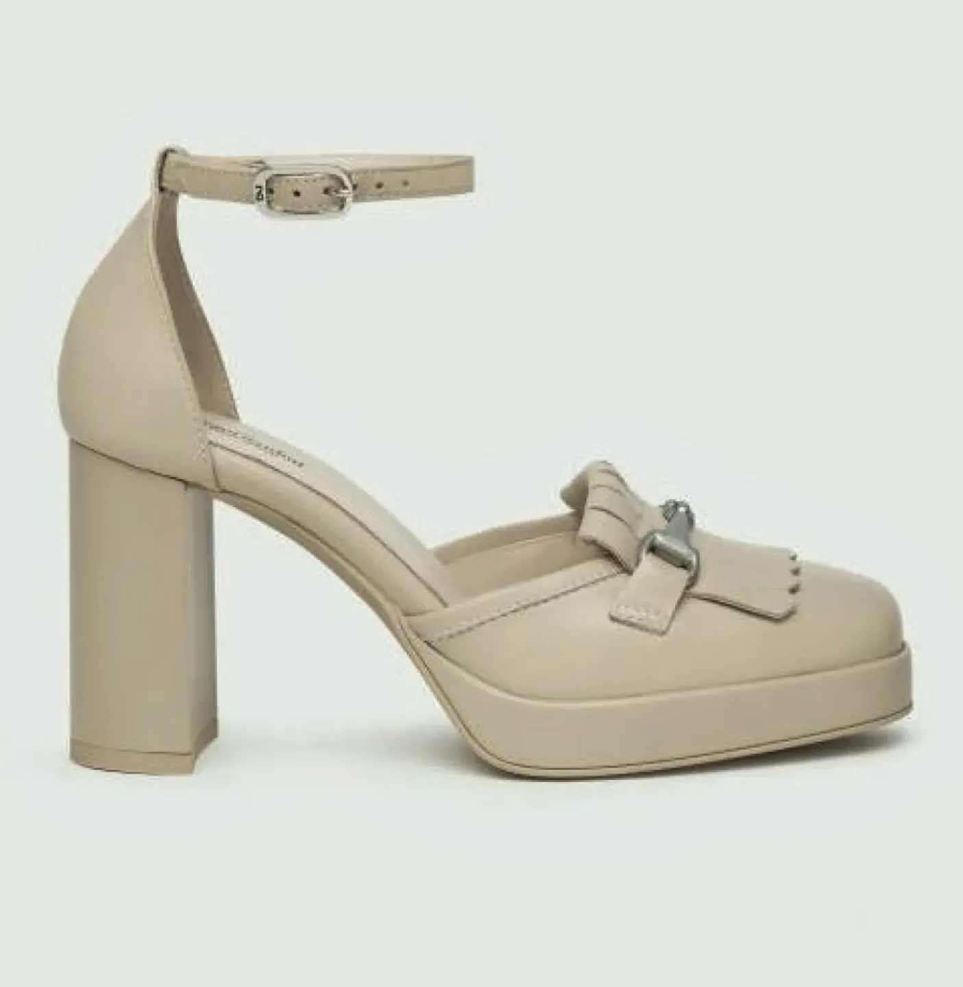 Decollette in pelle color lino con cinturino alla caviglie, Rivestito internamente in pelle. Decorazione con frange in pelle e fibbia metallica. Tacco a blocco 9 cm.