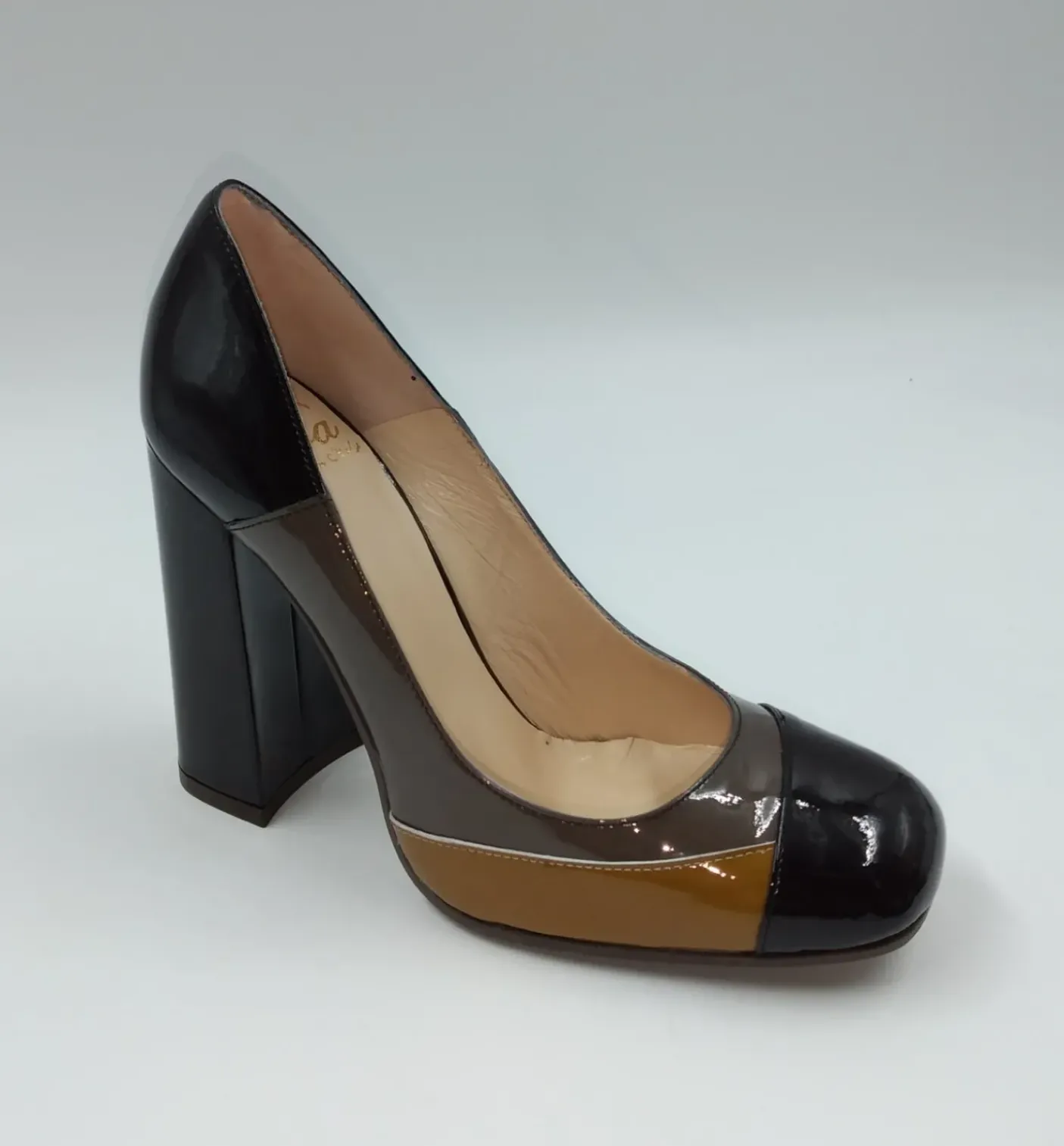 Scarpa decolleté in Vernice vera pelle in tre colori. Tutta rivestita internamente di pelle. Tacco quadrato rivestito in pelle 10 cm. Comoda e mordida con calzabilità regolare.