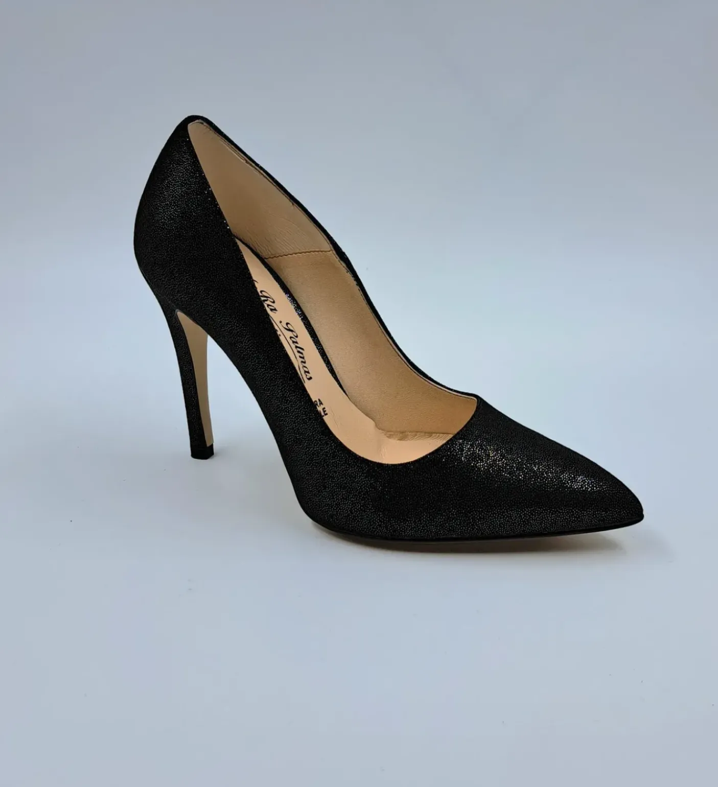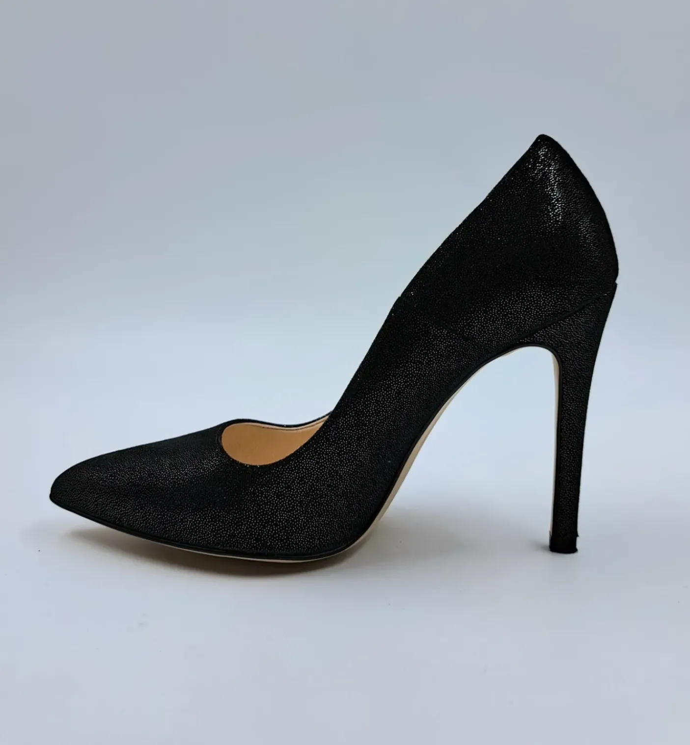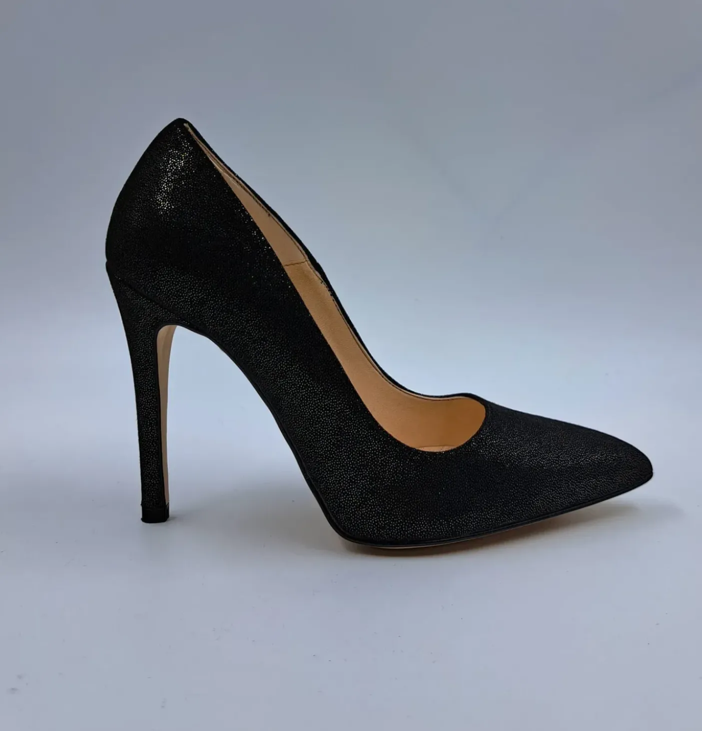 Decollete in tessuto nero lux. Interno rivestito in pelle. Soletta in pelle. Fondo gomma tacco 10cm