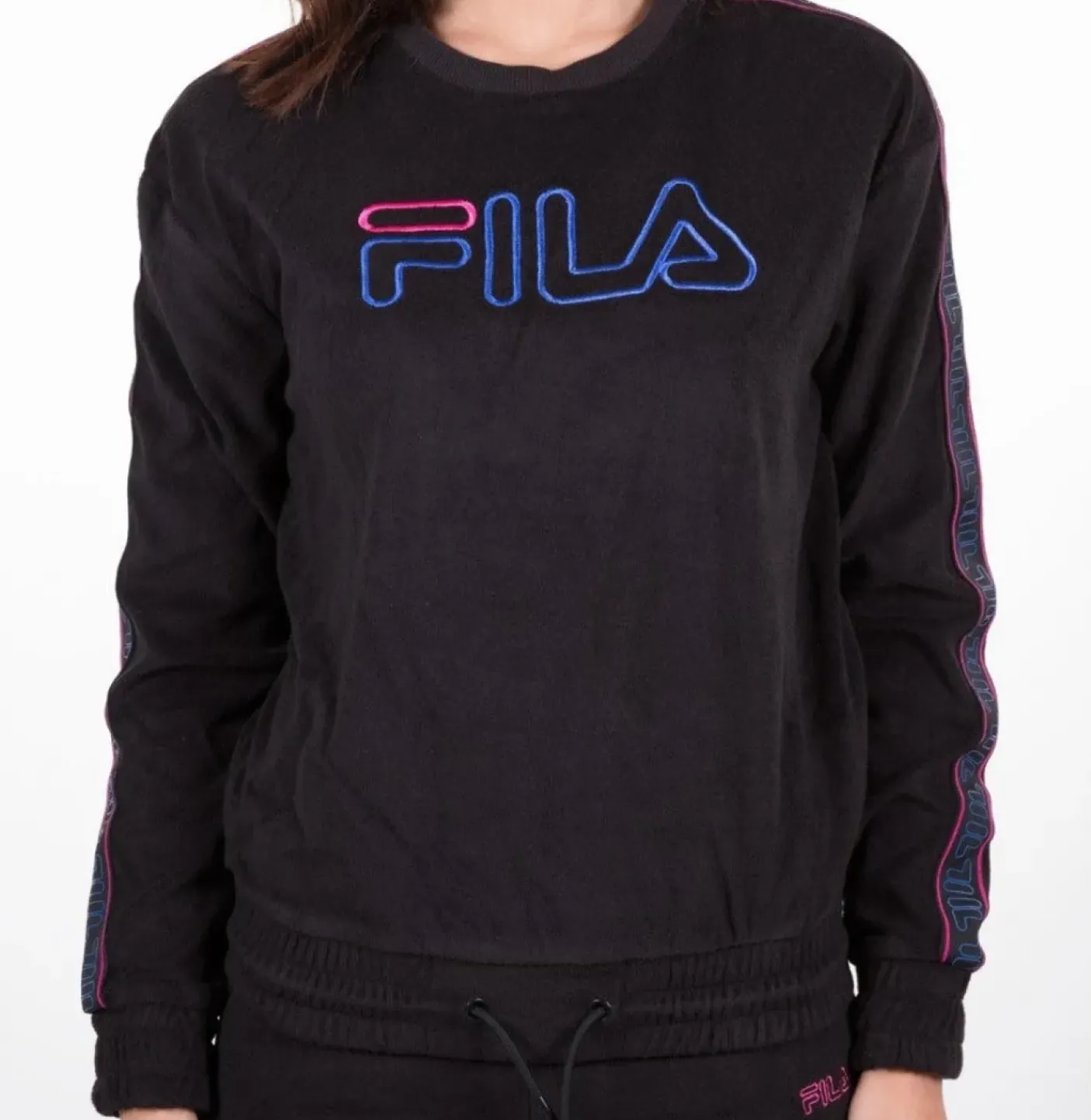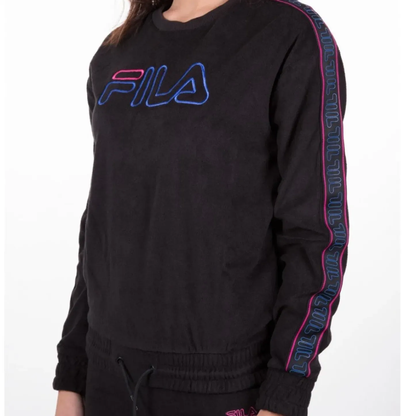 Felpa in cotone vellutato con maxi logo frontale. girocollo e polsini a costina. Elastico alla base con laccetto. Fasce logate colorate sulle maniche.