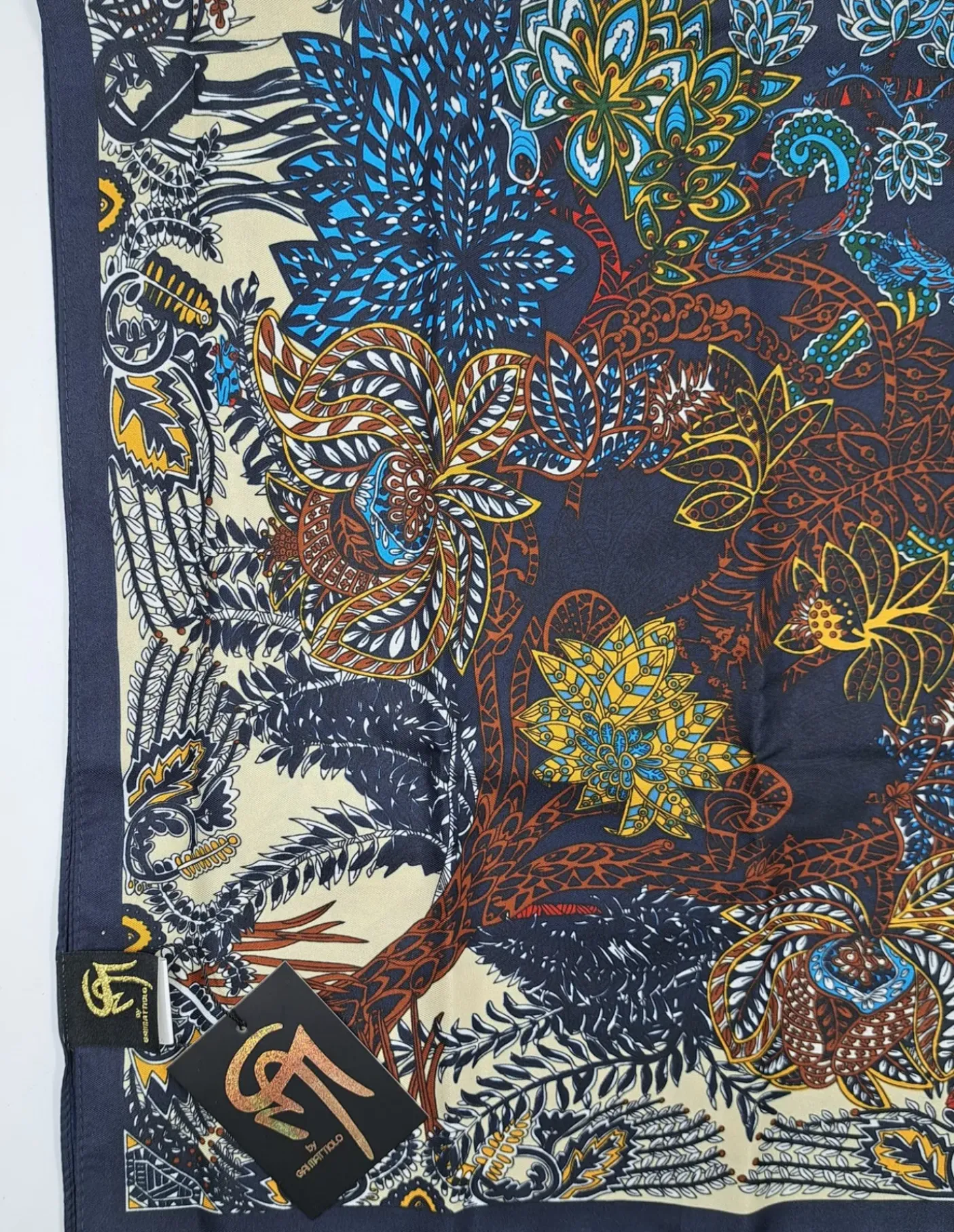 Foulard 100% vera seta. Fantasia su base blu. Confezione con scatola logata.