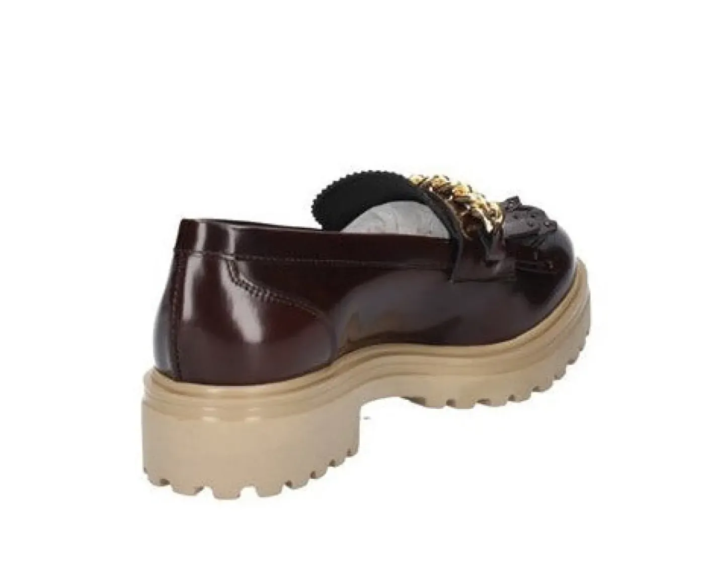 Mocassini in pelle morbida lucida. Rivestita internamente in pelle. Applicazione catena oro e frange in pelle. Soletta in pelle. Fondo in gomma 4cm