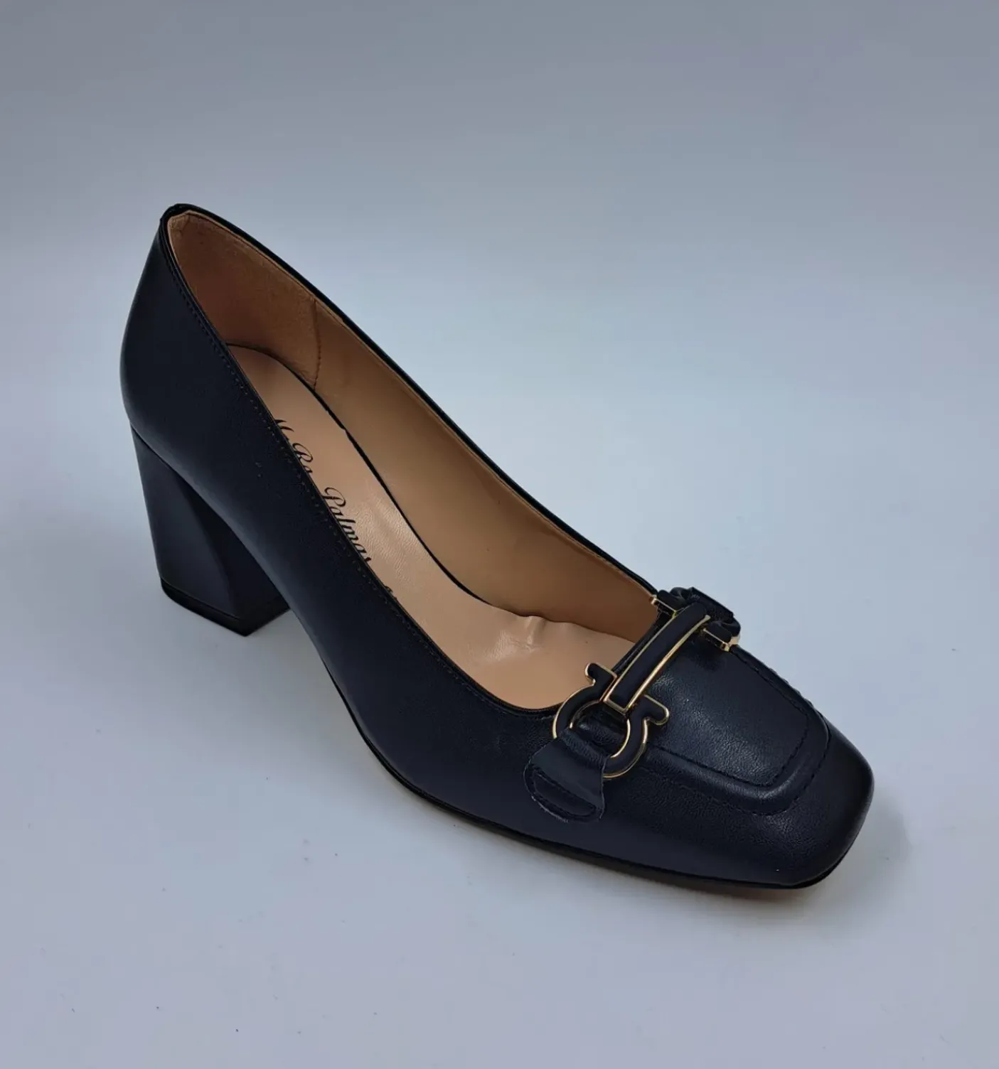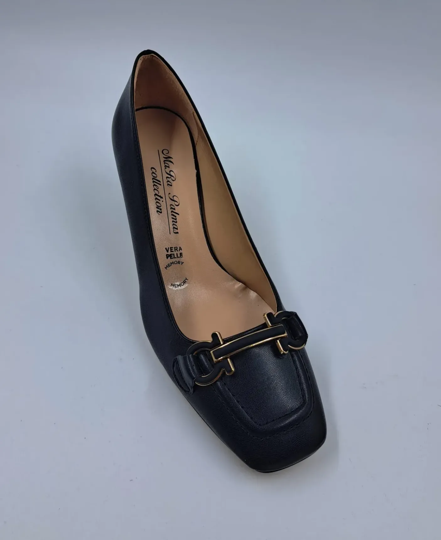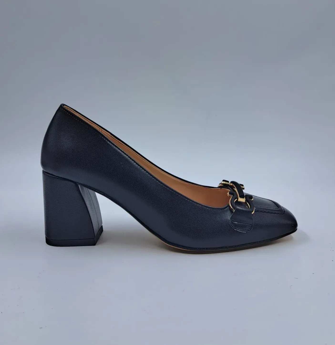 Mocassino in ecopelle rivestito internamente in pelle. applicazione metallica color oro e smalto nero. Soletta in pelle con leggero memory. Punta squadrata. Tacco 8cm