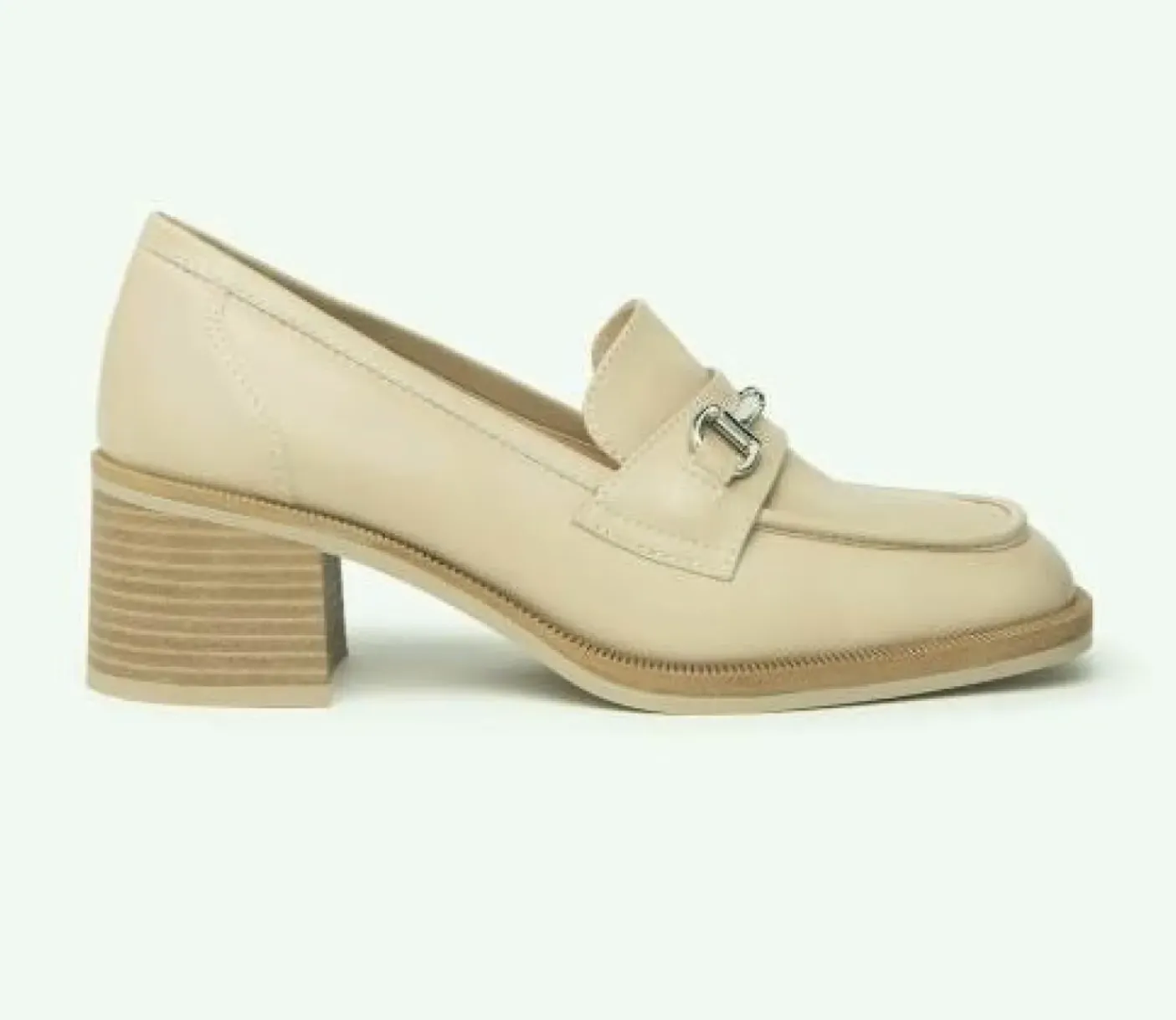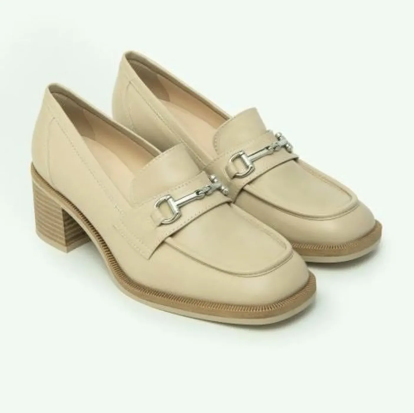 Mocassini in pelle rivestito internamente in pelle. Applicazione metallica in color argento. Tacco a blocco a contrasto 5cm. Fondo gomma.