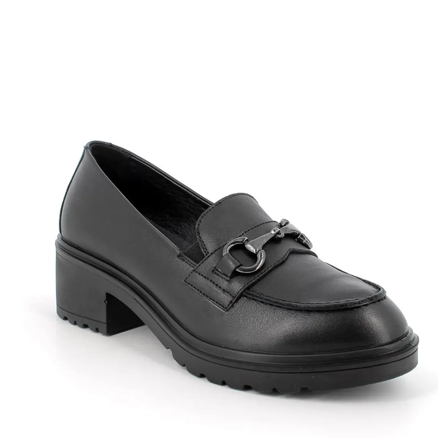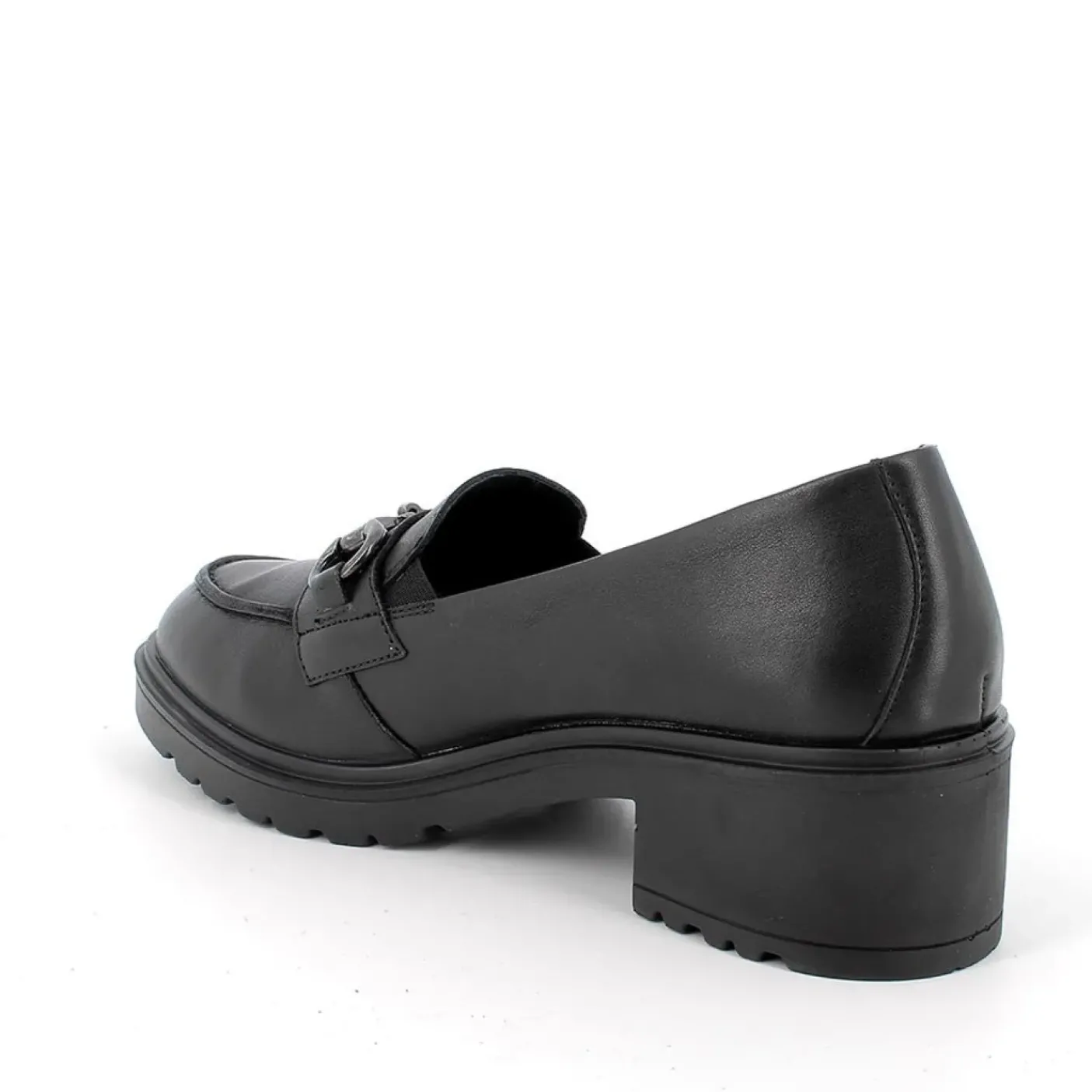 Mocassini in pelle morbida. rivestito internamente in pelle. Soletta estraibile. Decorazione metallica. Tacco squadrato 4,5. Elastici sui lati.