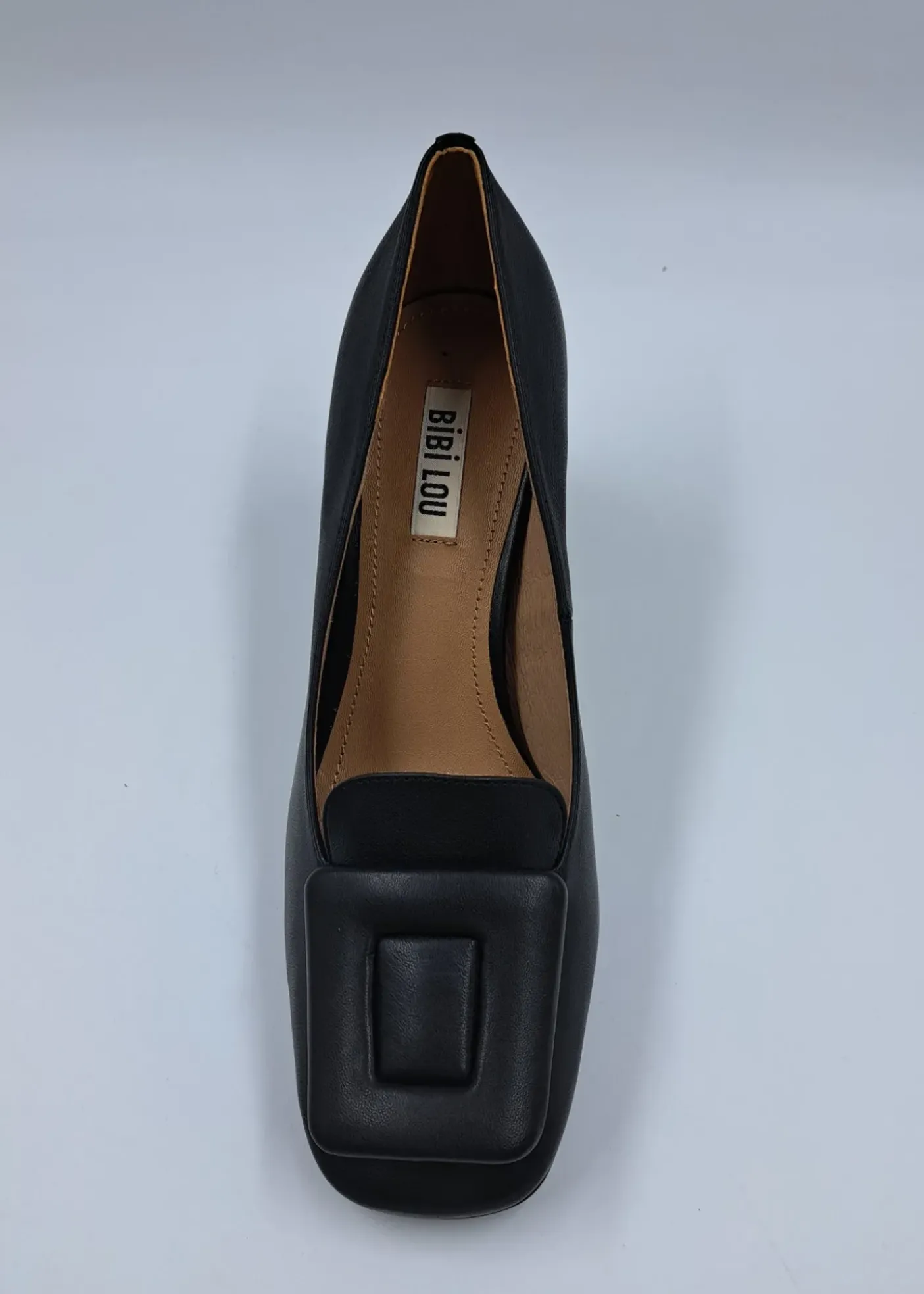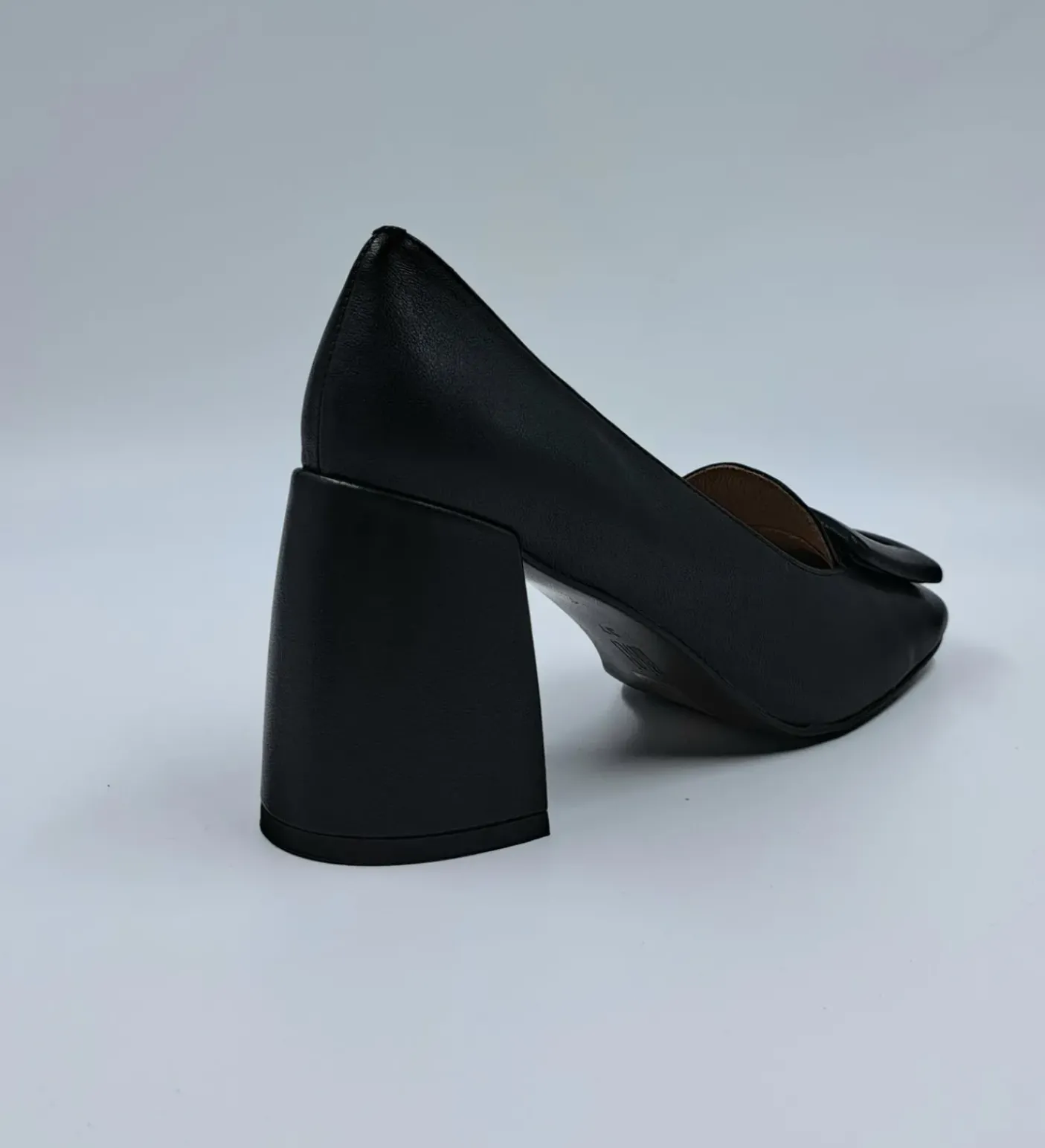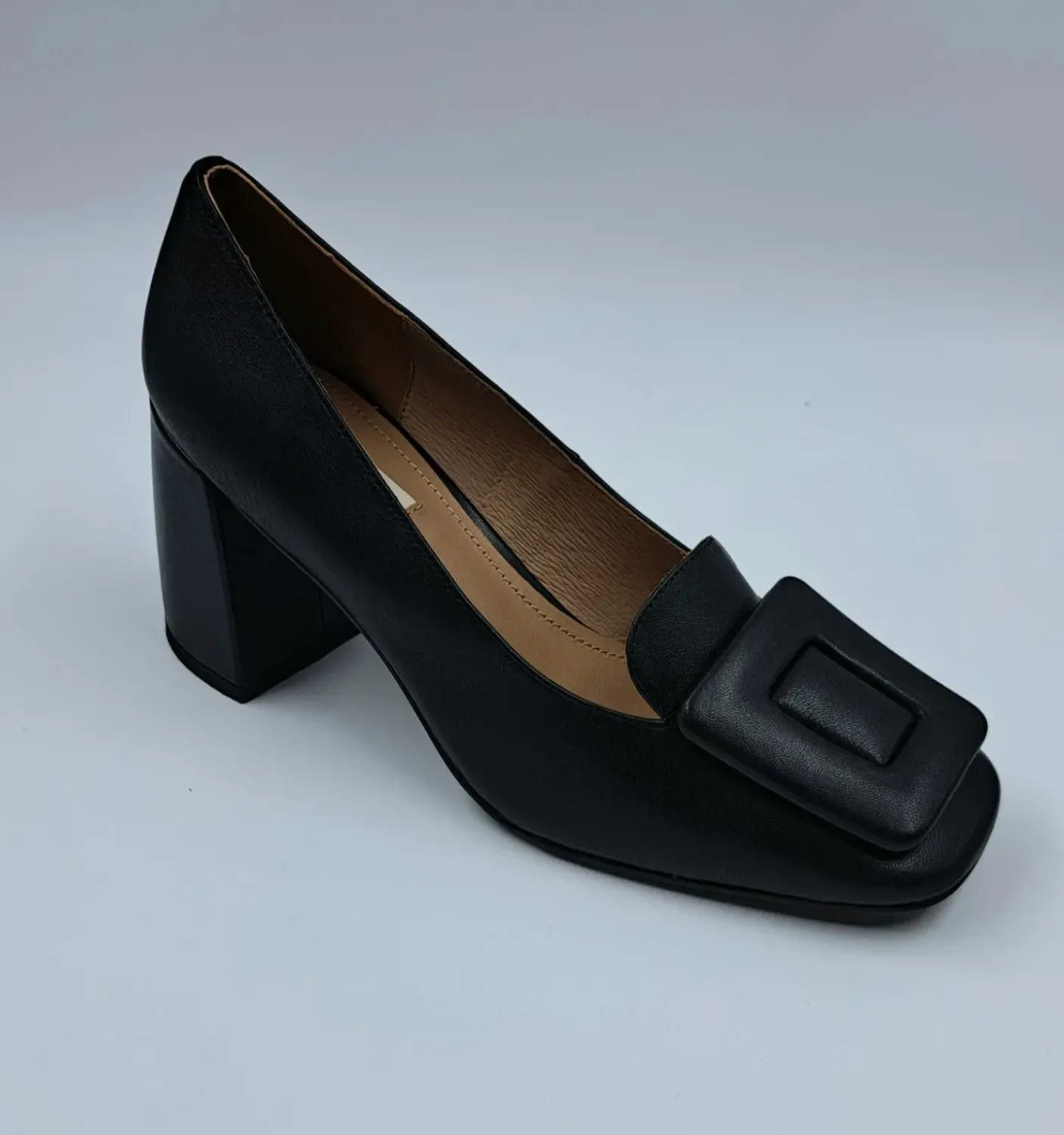 Mocassino in vera pelle morbida. Rivestito internamente in pelle. Applicazione squadrata rivestita in camoscio. Tacco squadrato 8cm.