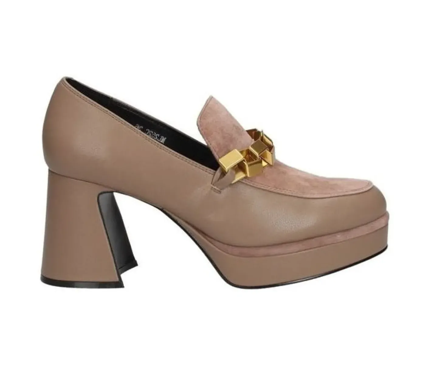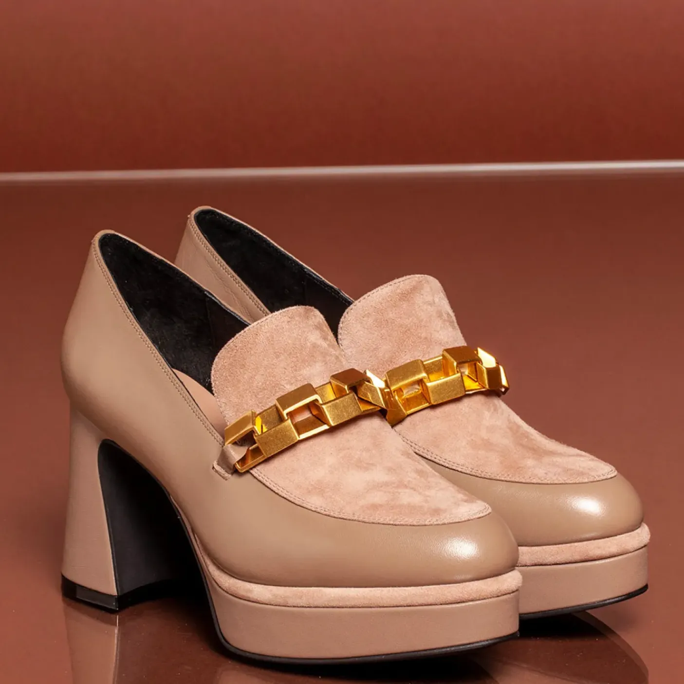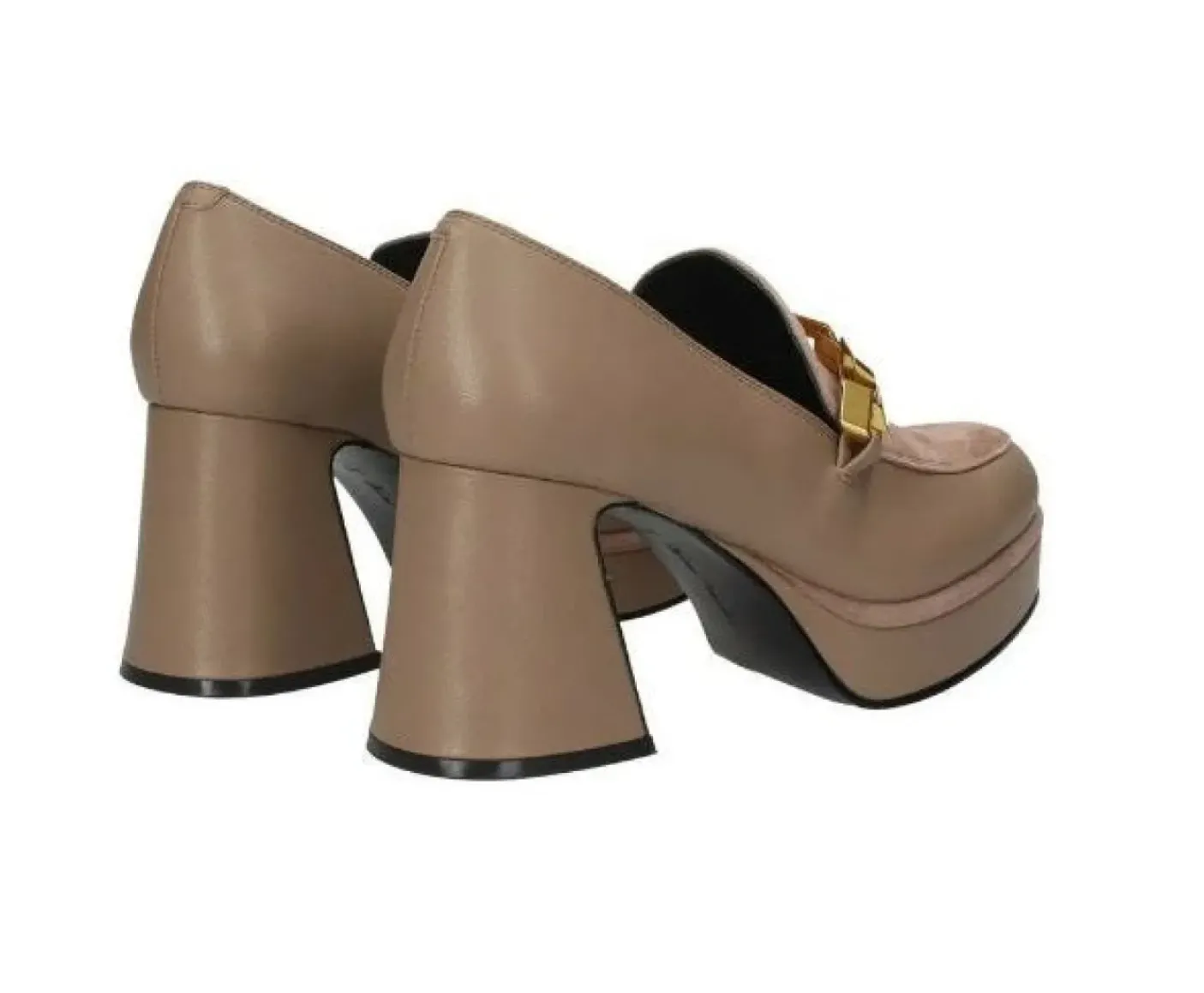 Mocassini in vera pelle morbida con inserto camoscio e applicazione metallica. Rivestita internamente in pelle. Tacco 8cme con platot 3cm.