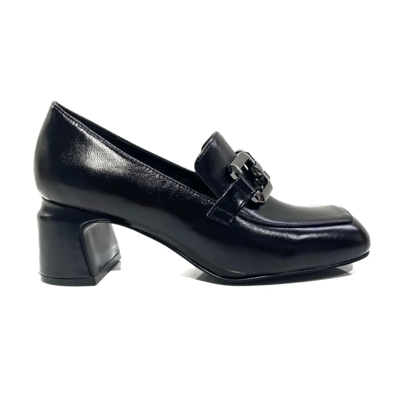 Mocassini in pelle. Rivestito internamente in pelle. Fibbia decorativa metallica. Punta squadrata. Tacco squadrato 6cm