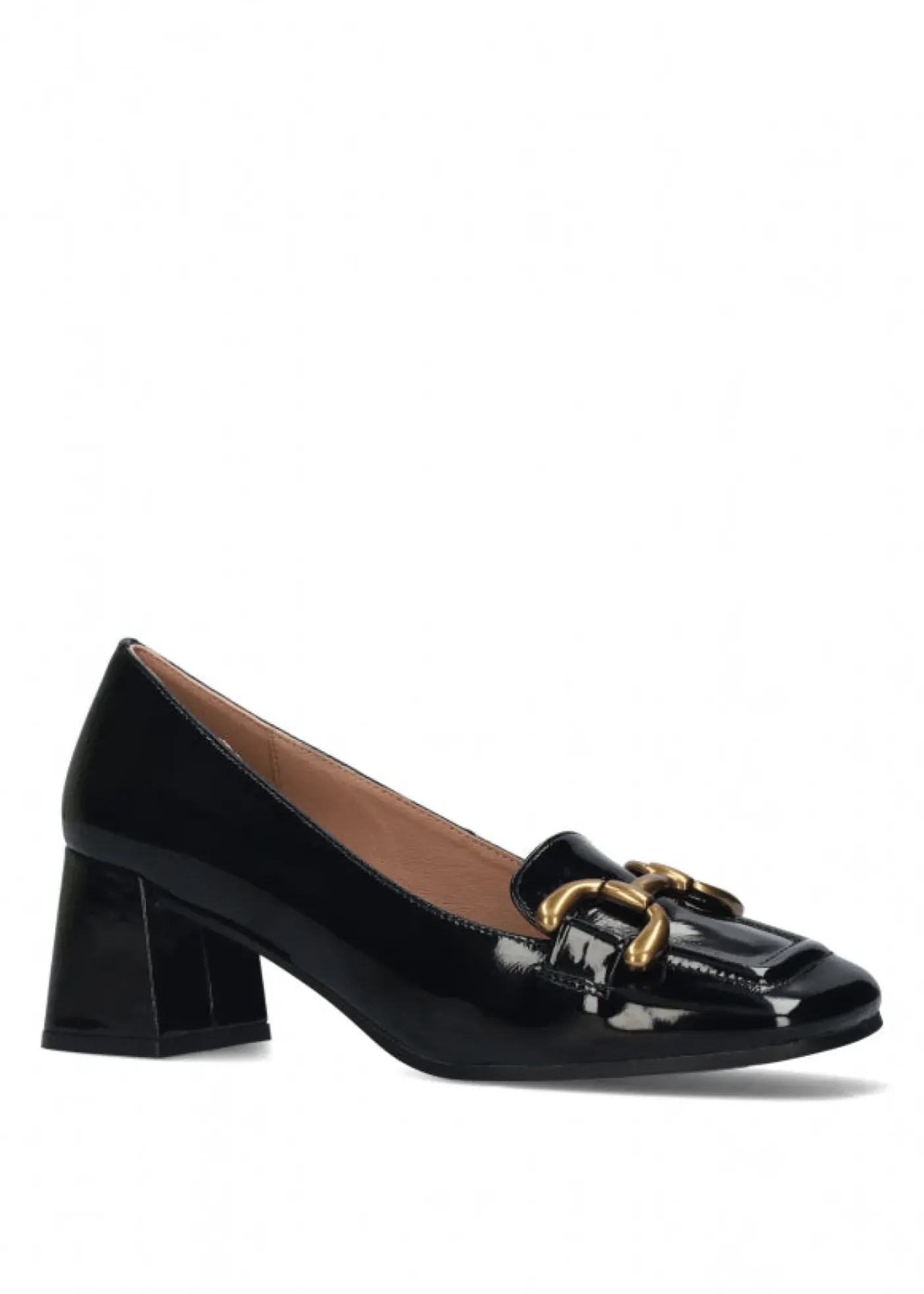 Mocassino in vera pelle lucida. Rivestito internamente in pelle. Applicazione metallica bronzo. Tacco squadrato 6cm.