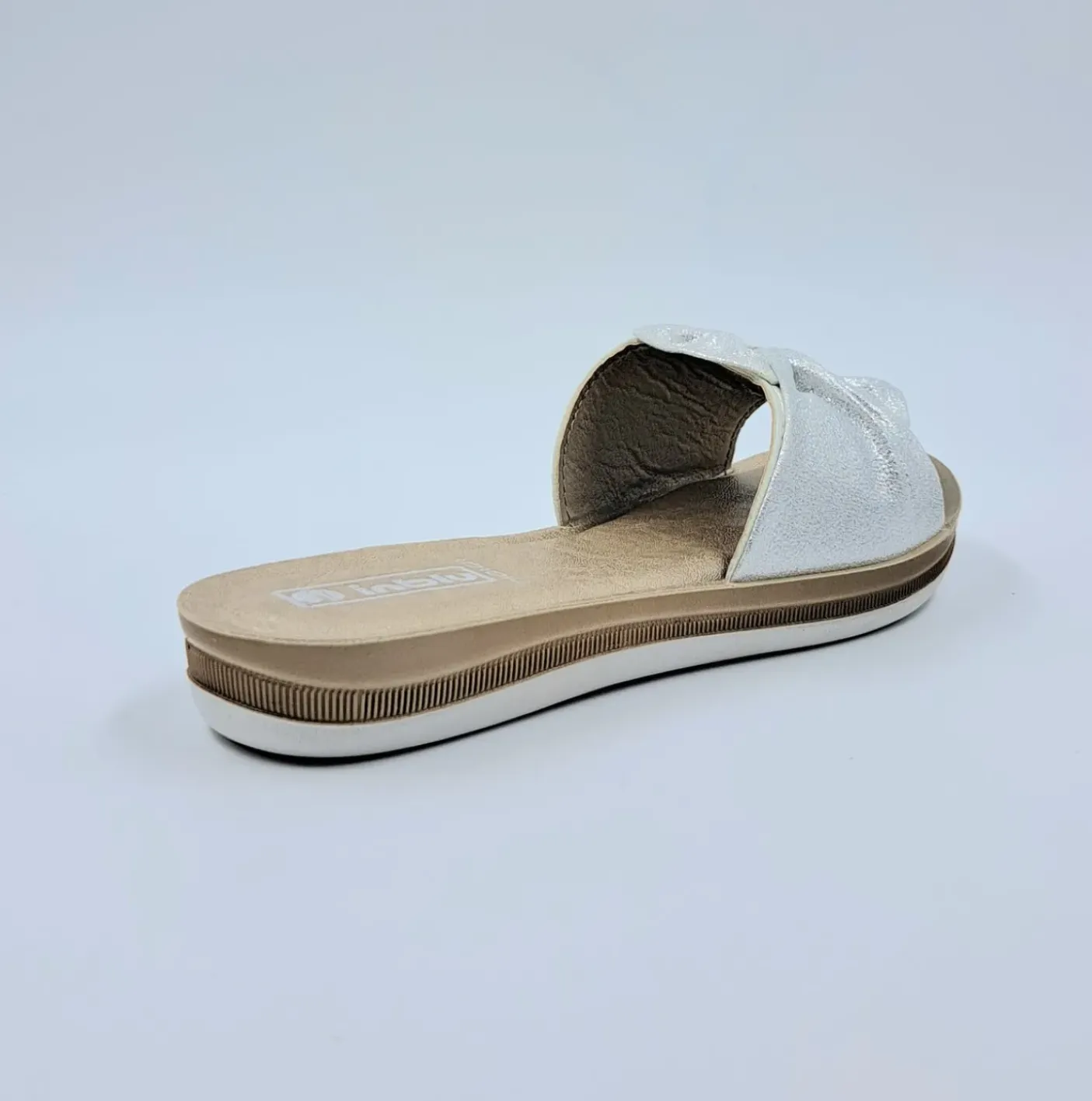 Pantofole in ecopelle bianco effetto glitterato. Soletta in ecopelle memory. Fondo gomma 2.5cm