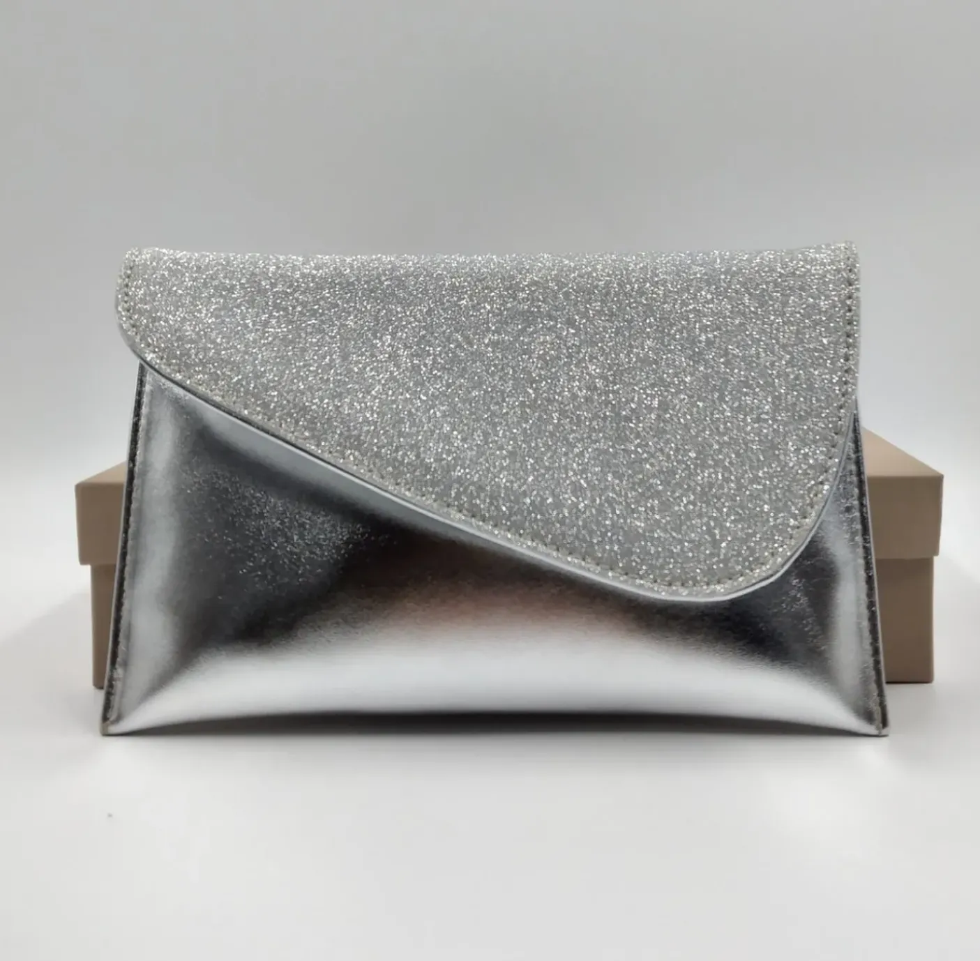 Pochette in ecopelle con patta tessuto glitter. Rivestita internamente in tessuto. Tracolla in metallo argento.
