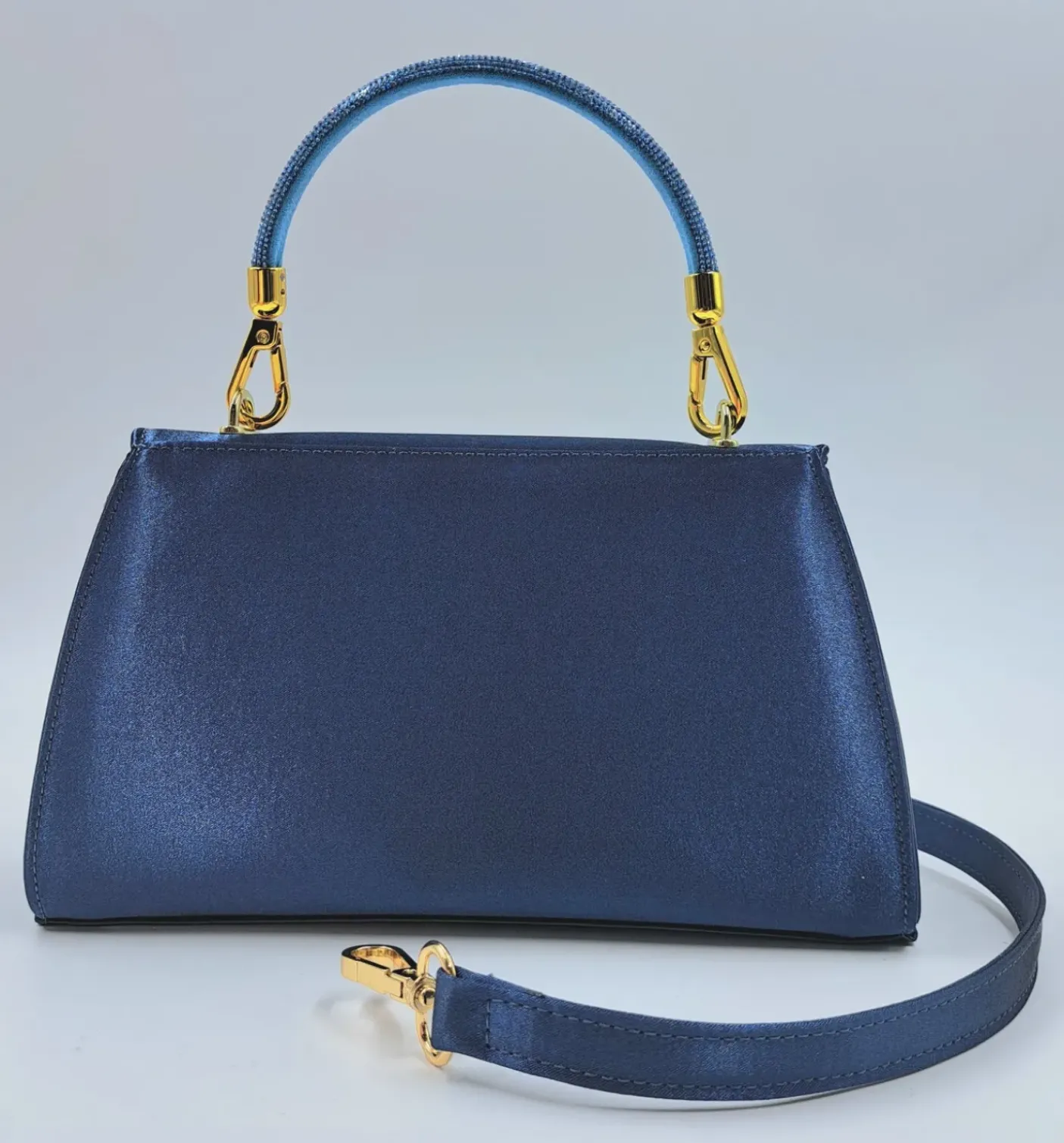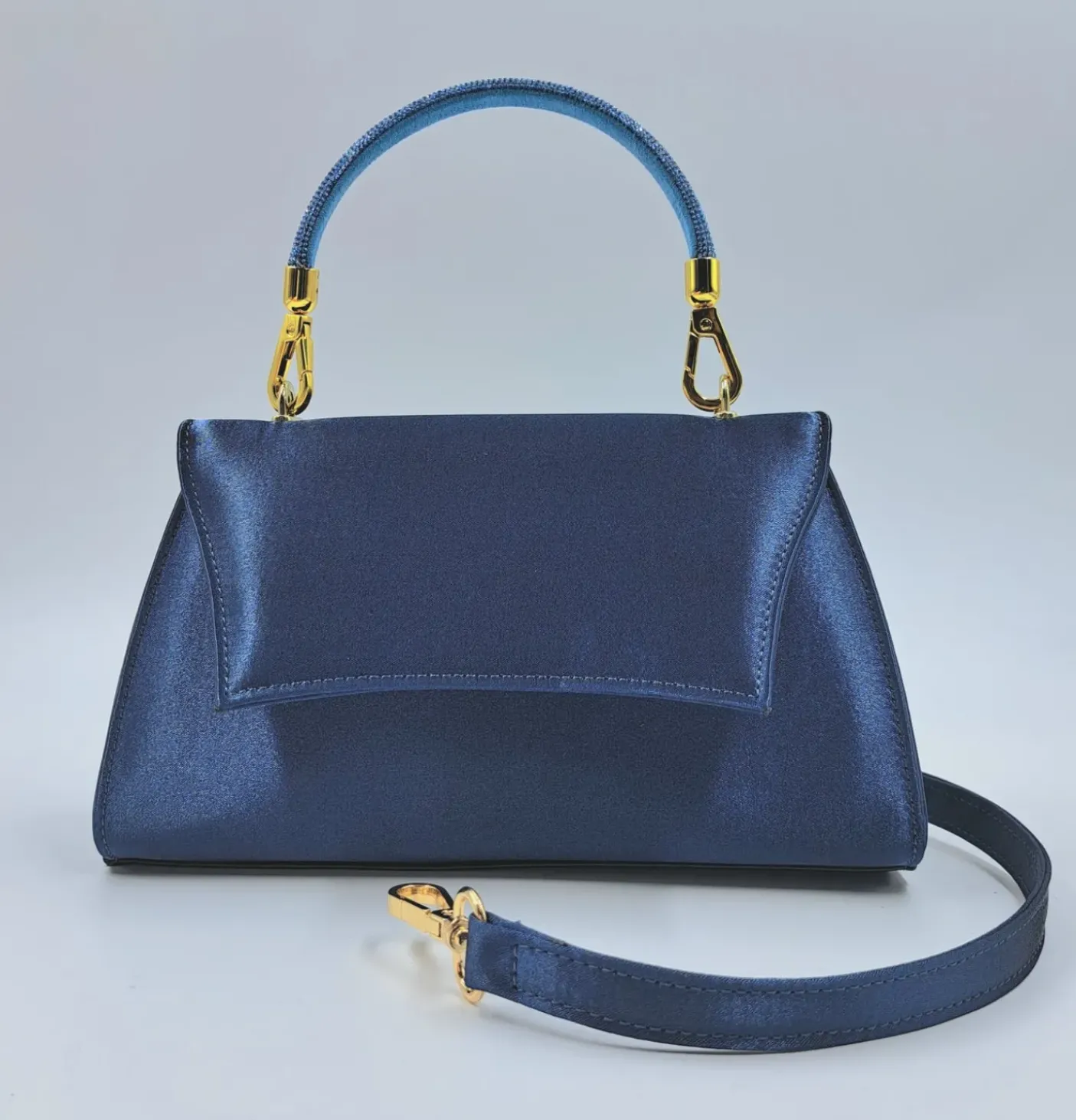 Pochette in raso nero con chiusura a patta con clip. rivestita internamente in tessuto. Dettagli in metallo gold. Doppio manico in strass e tessuto nero removibili.