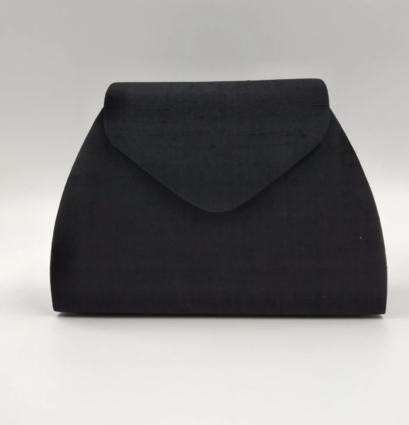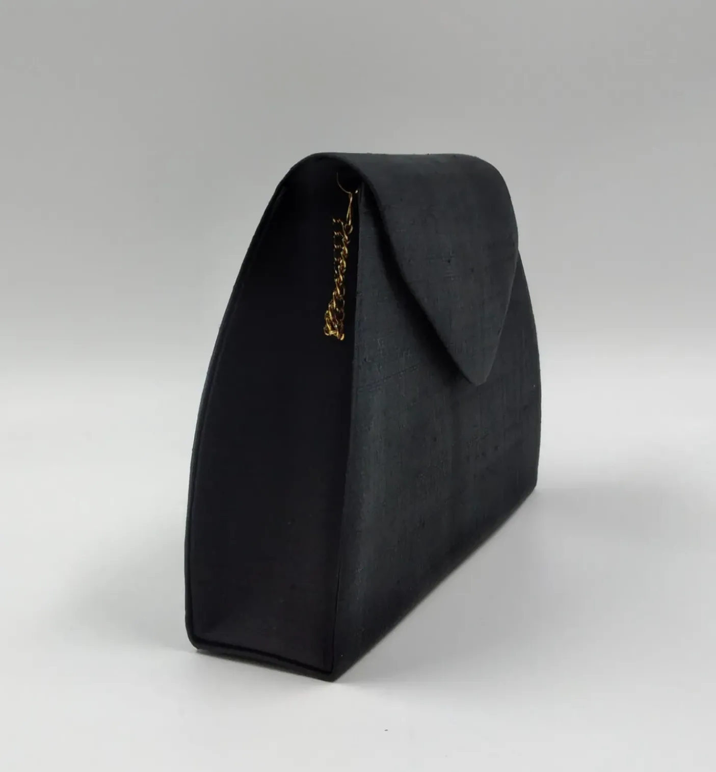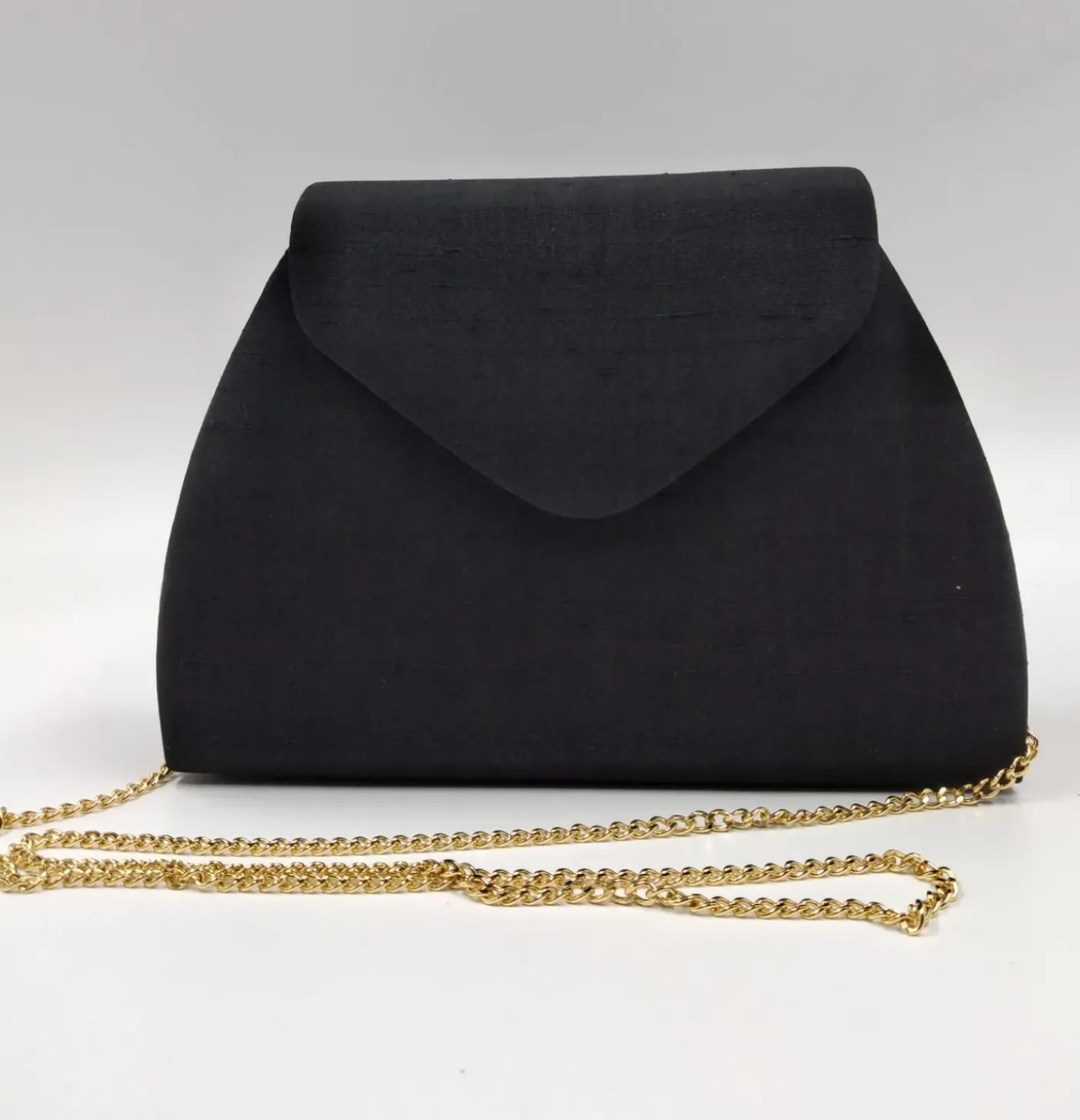 Pochette in satin nero con effetto quadri. Chiusura con patta. Rivestita internamente in stoffa. Tracolla in catena color oro.