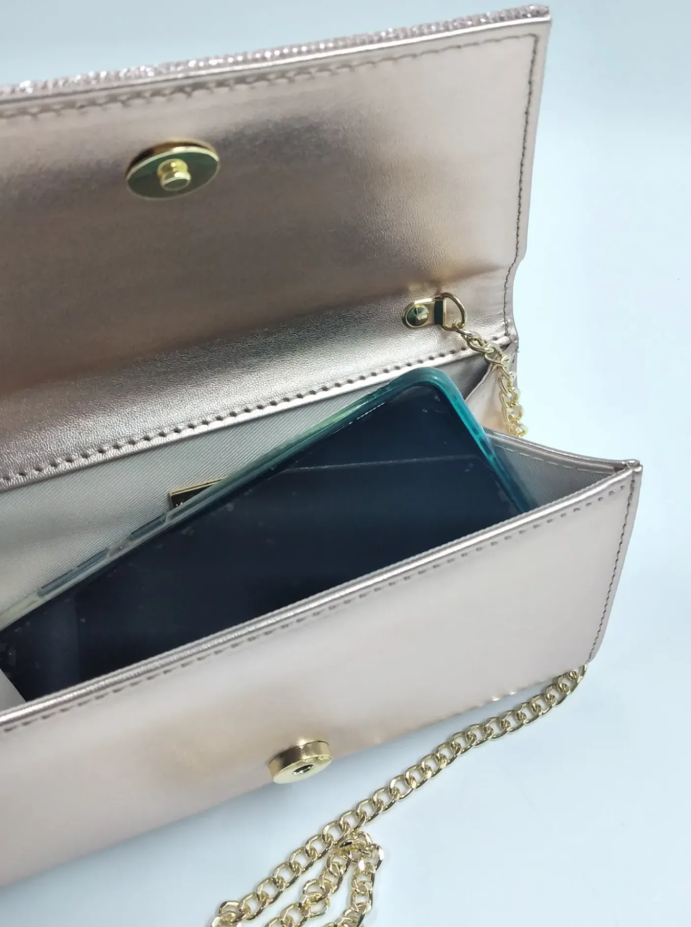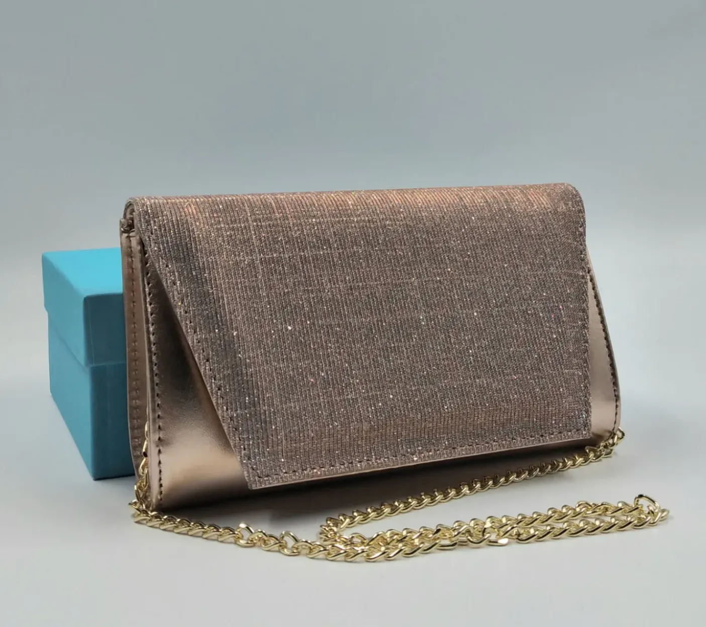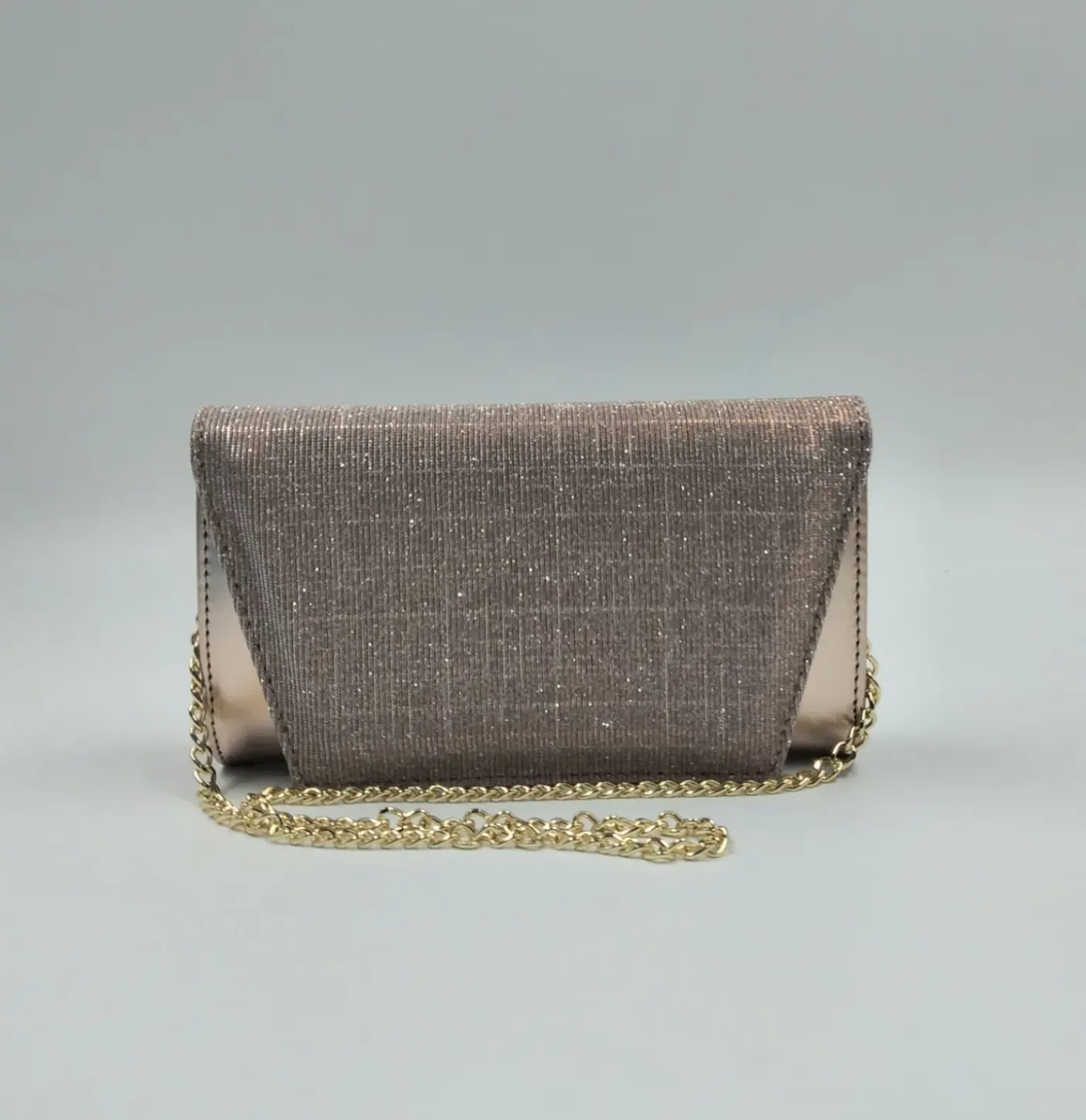 Pochette in ecopelle color rame con patta decorata in tessuto rosa lux. Chiusura con bottone clip. Tracolla metallica oro.