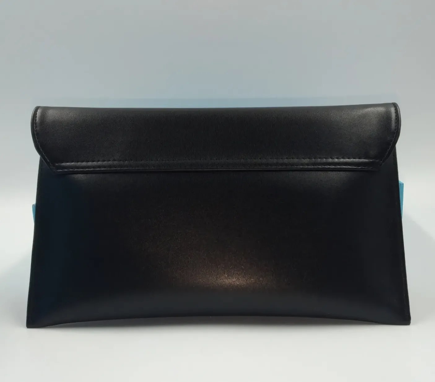 Pochette in ecopelle nera, chiusura con patta e bottone clip. Tracolla in catena argento.