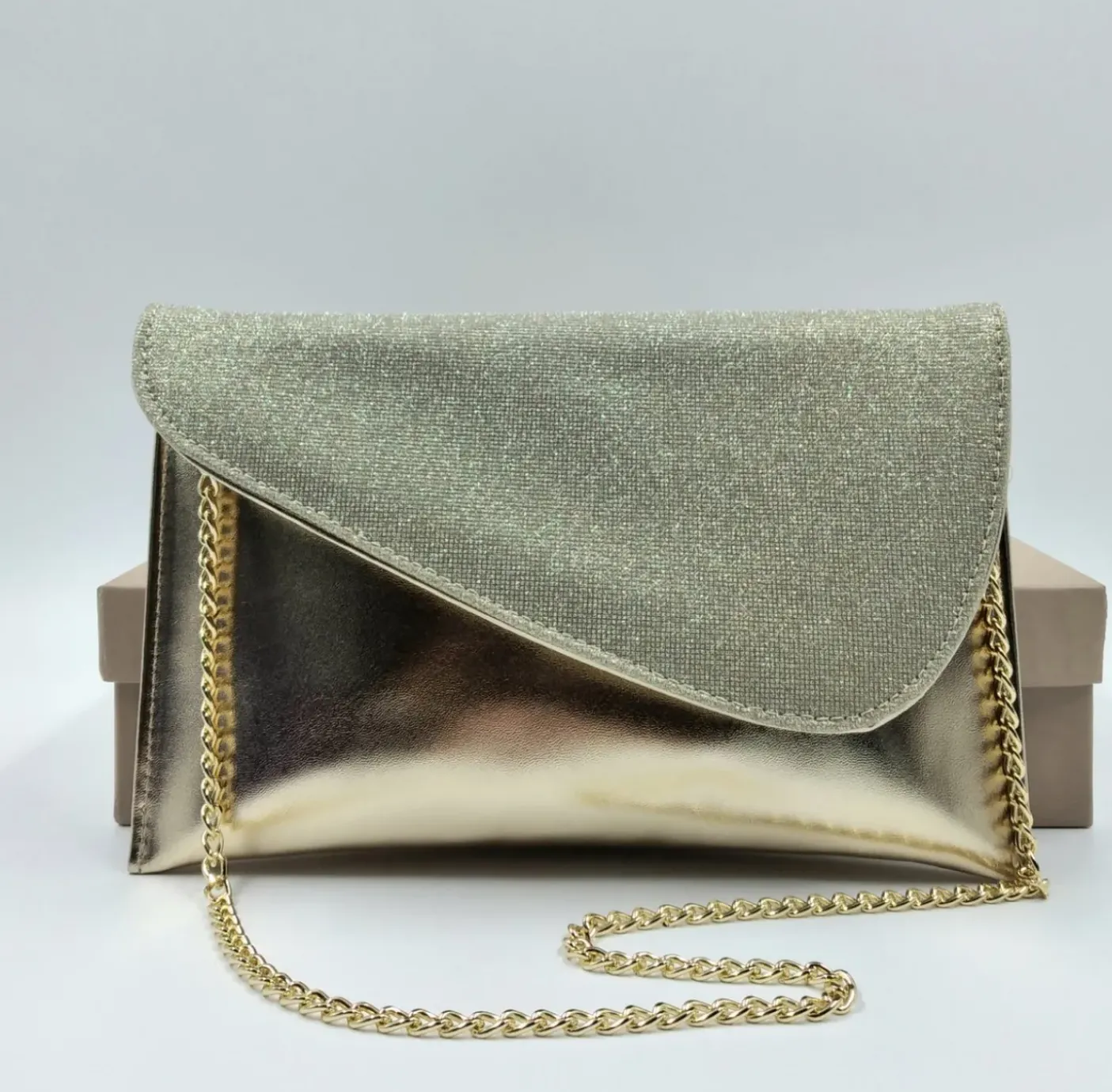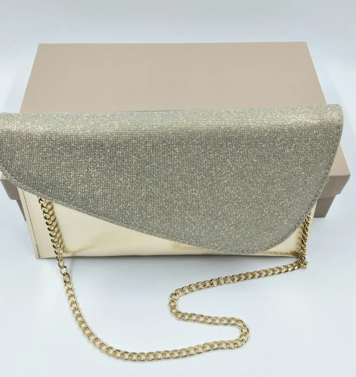 Pochette in ecopelle con patta tessuto glitter. Rivestita internamente in tessuto. Tracolla in metallo oro. Chiusura con patta e bottone clip.