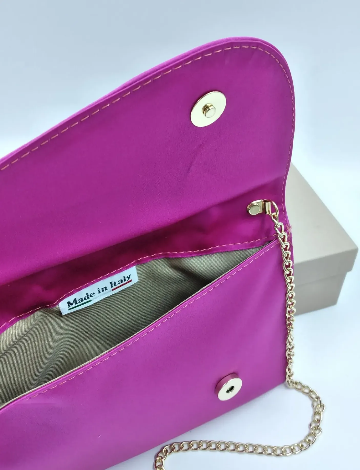 Pochette in raso fuxia, rivestita internamente in tessuto. Tracolla in metallo oro. Chiusura con patta e bottone clip.