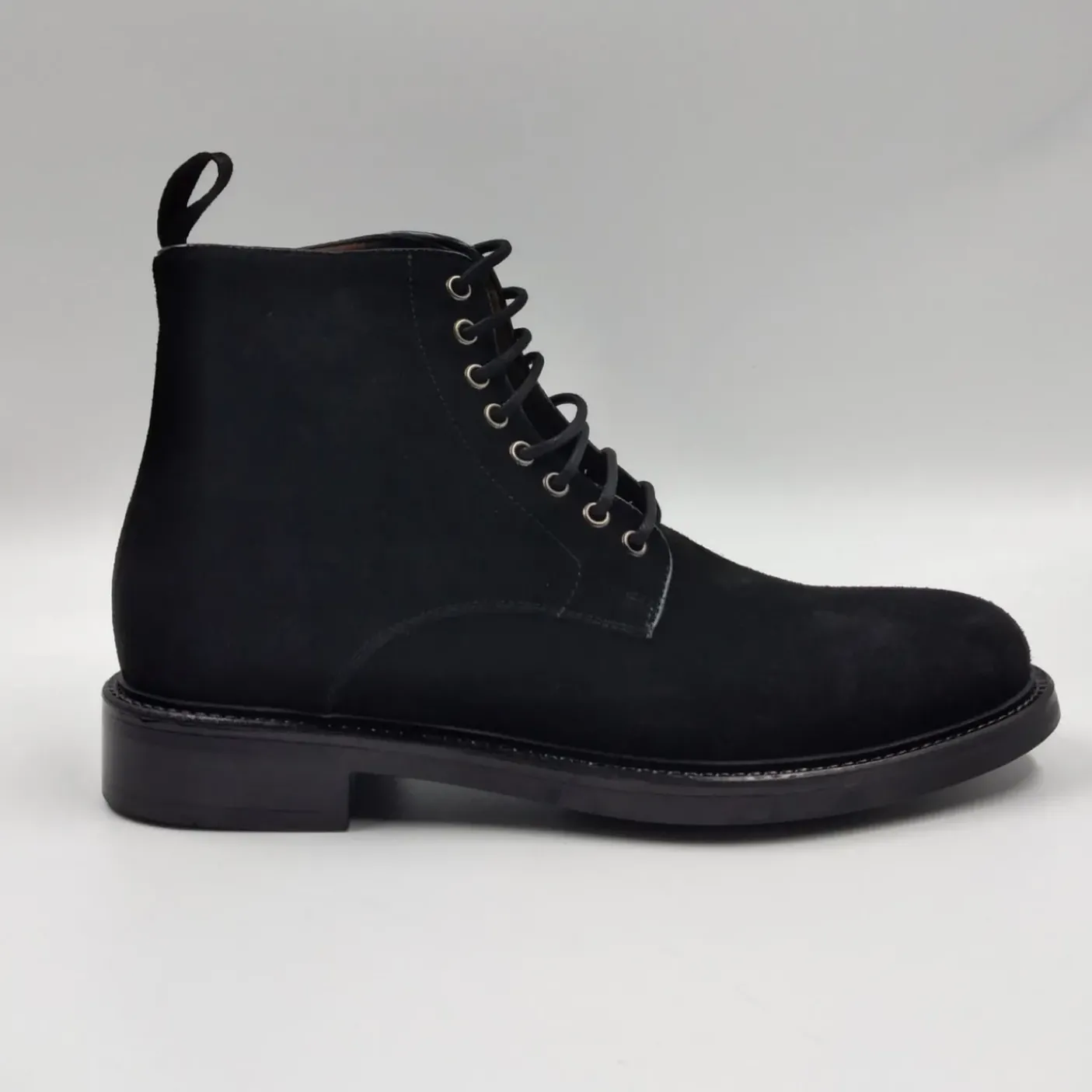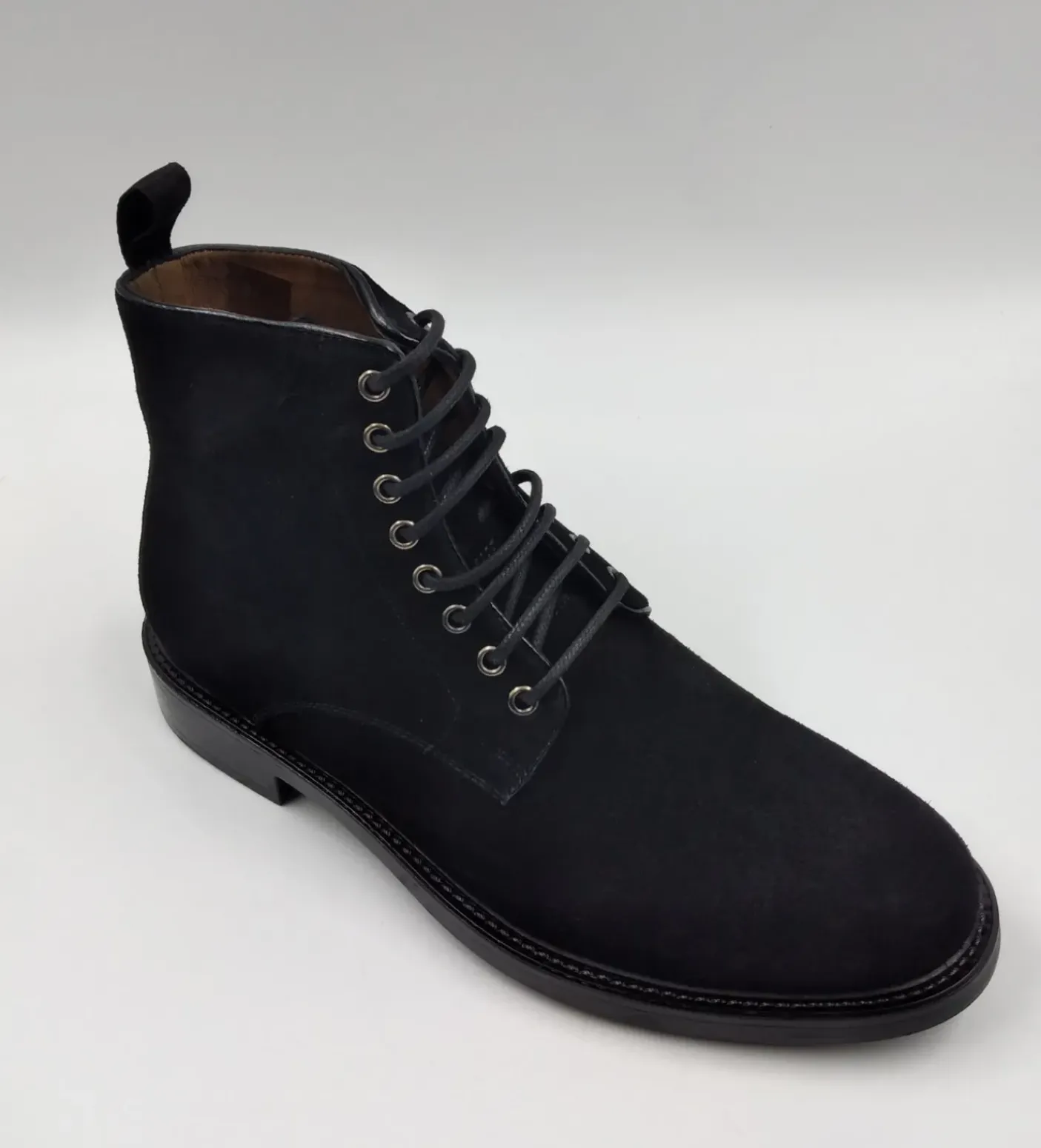 Polacchini in vero camoscio, rivestito internamente in pelle. Chiusura con lacci. Fondo in gomma 3cm.