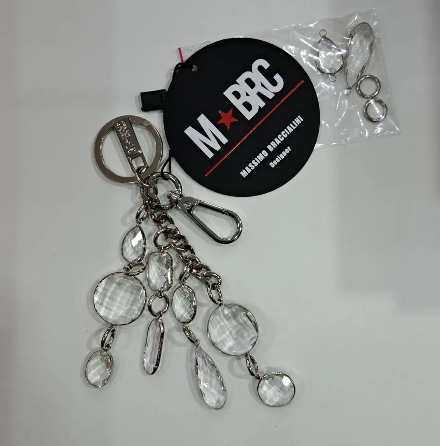 Portachiavi con catena metallica argento, applicazioni strass trasparenti.