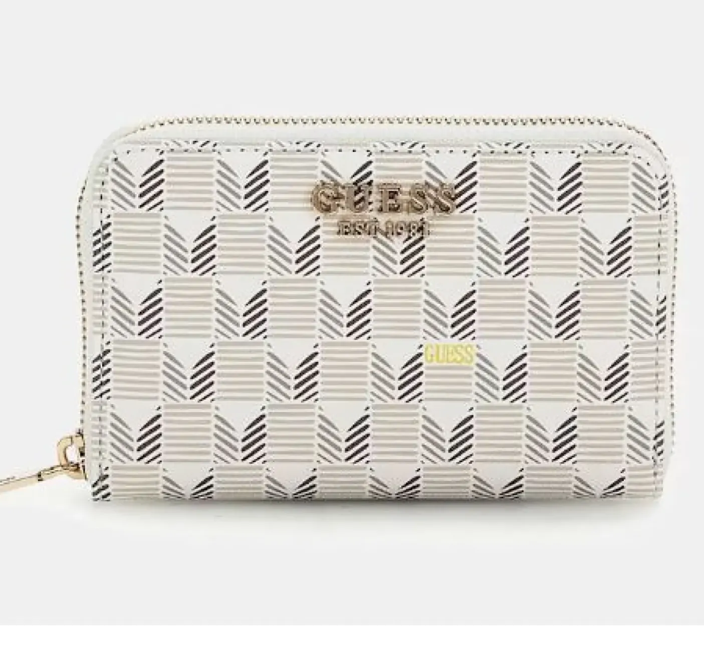 Portafoglio multi scomparto in ecopelle stampa geometric. Porta carte di credito e documenti. Porta monete con zip. Logo metallico frontale. Chiusura con zip.