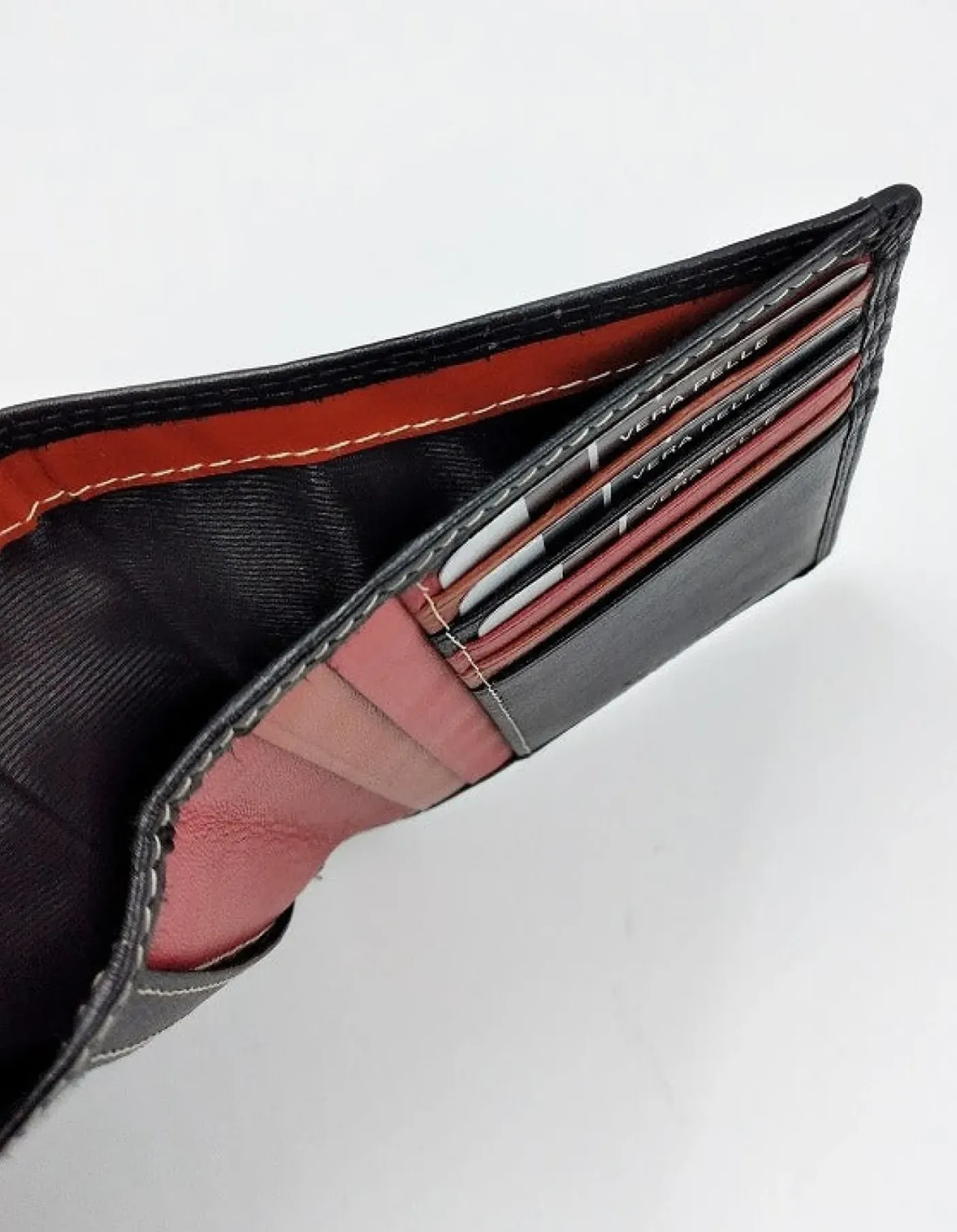 Portafoglio in vera pelle morbida, interno multicolor con porta tessere e credit card. Scomparto per banconote.