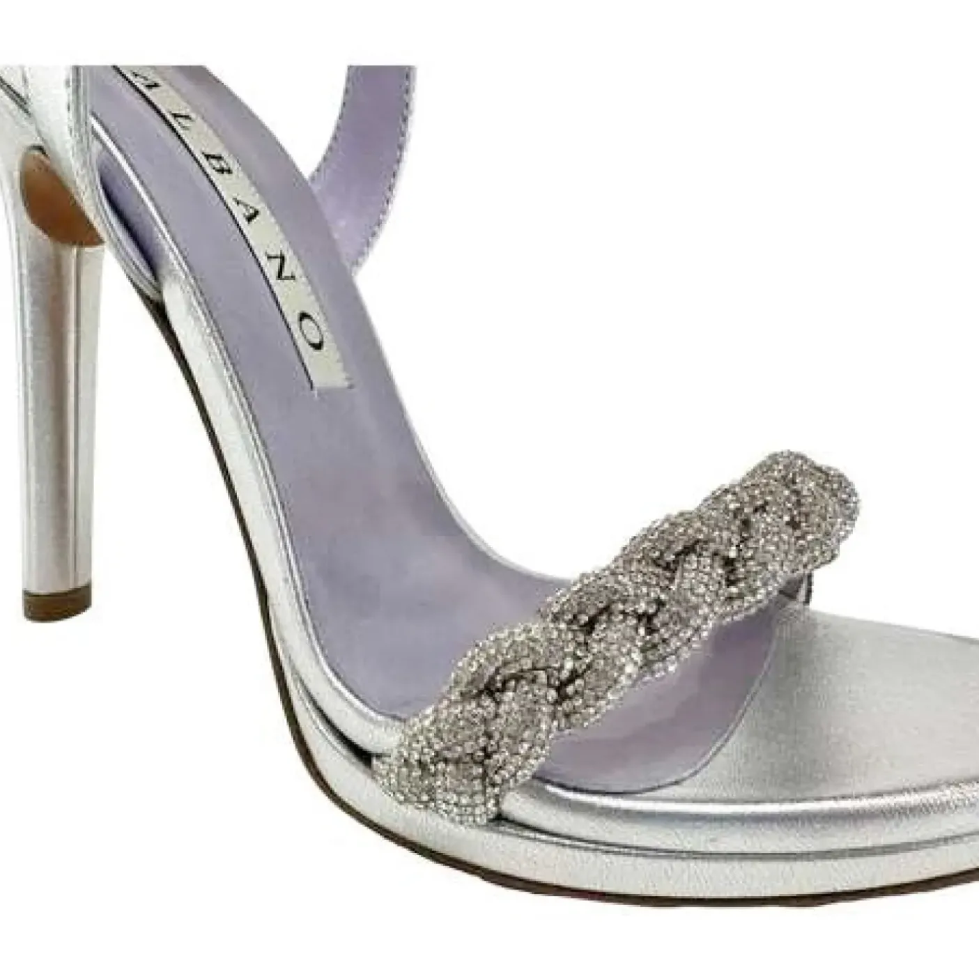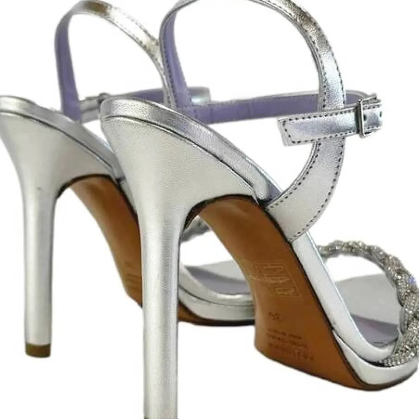 Sandalo in ecopelle con applicazione treccia strass. Rivestito internamente in pelle. Soletta in pelle. Cinturino regolabile alla caviglia. Suola in cuoio. Tacco 12cm