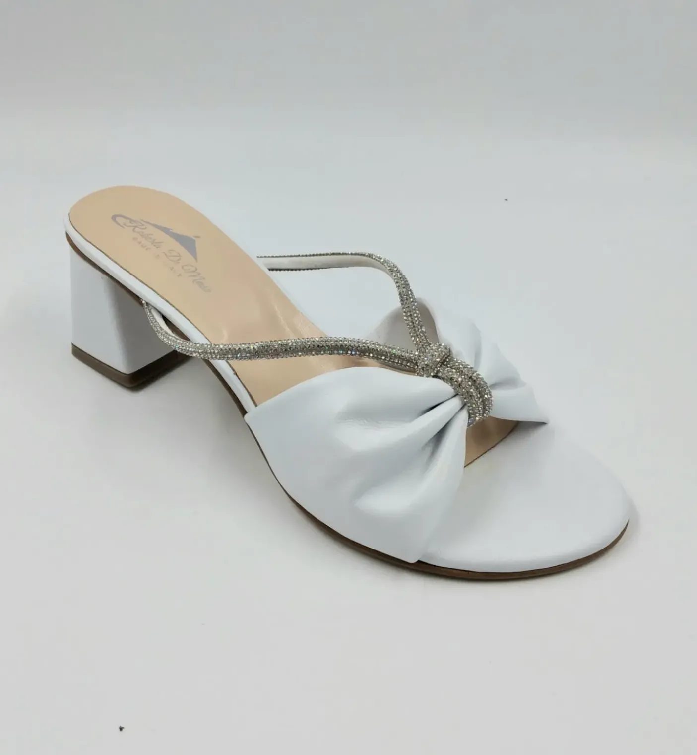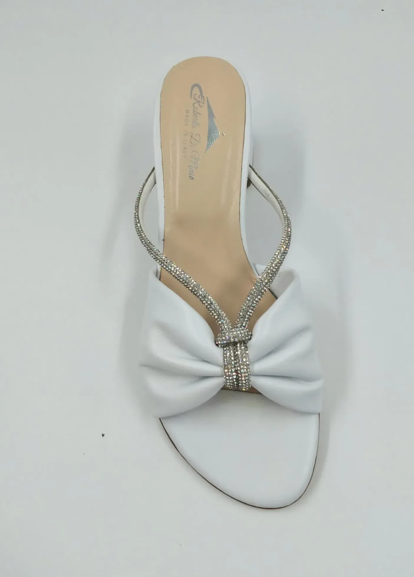 Sandali scalzati bianchi con applicazioni strass. Soletta in pelle. Tacco squadrato 5cm