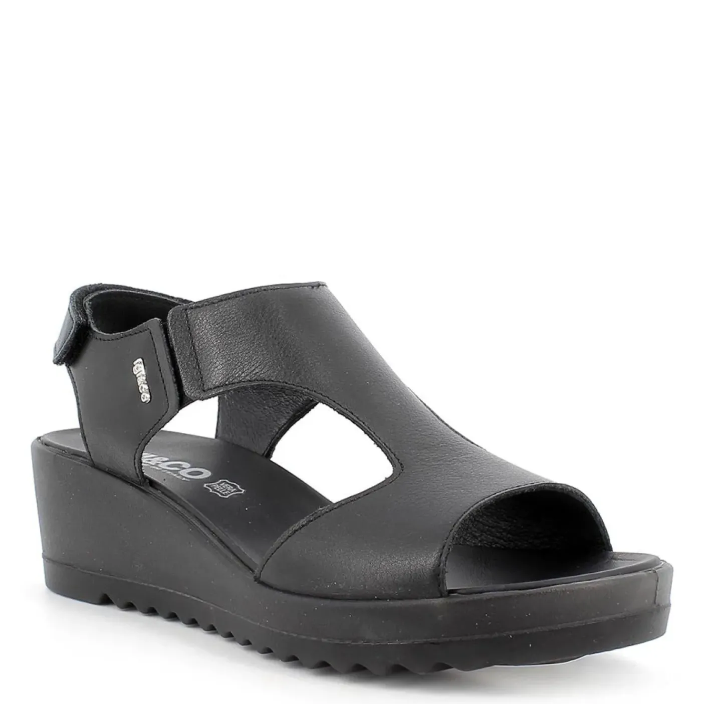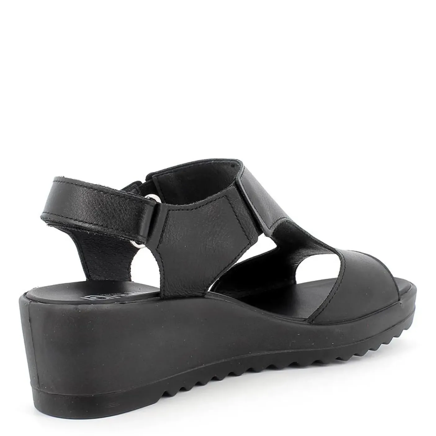 Sandalo in pelle , rivestito internamente in pelle. Con elastici laterali e chiusura con velcro. Fondo gomma. Zeppa 5cm