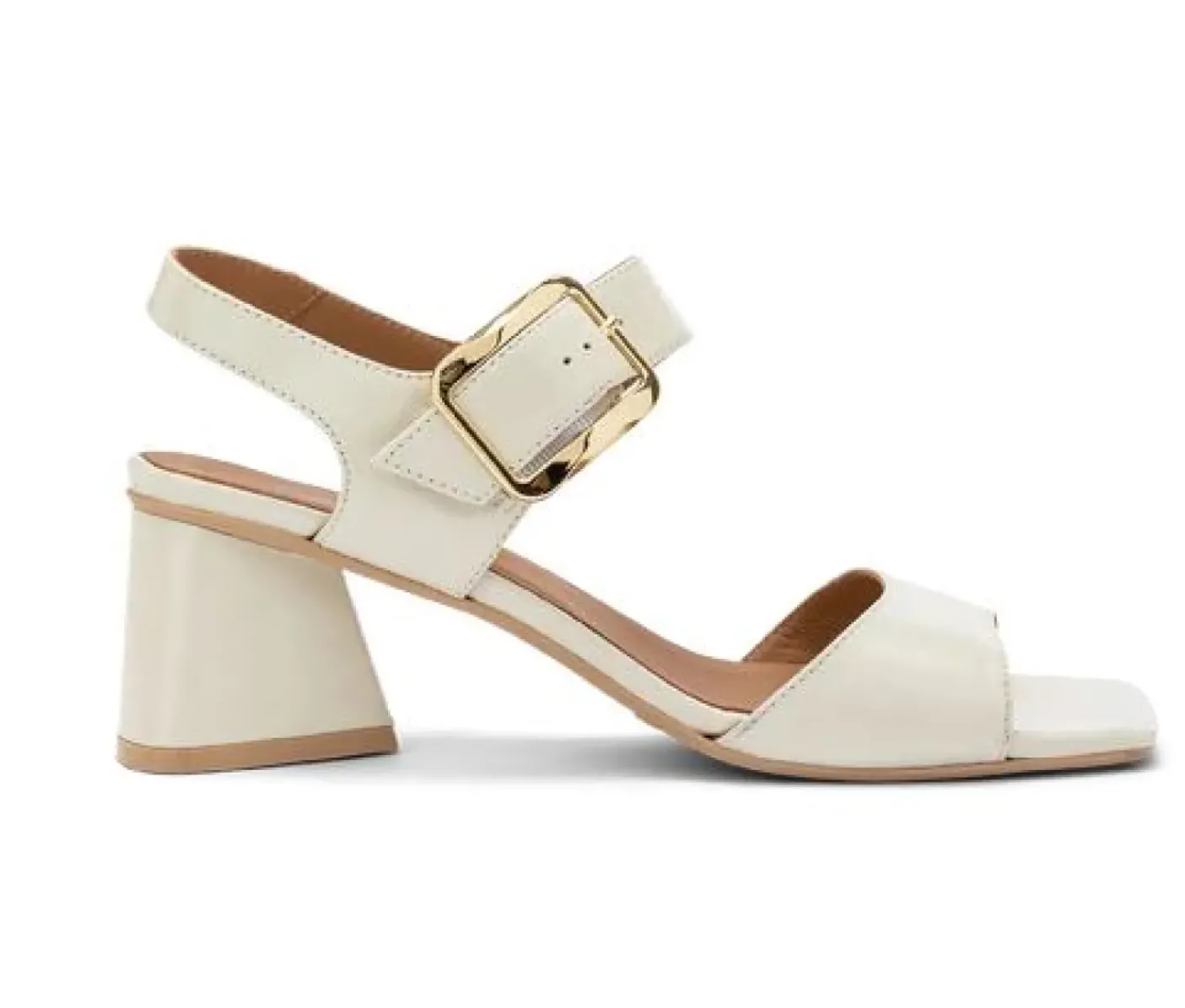 Sandalo in morbida pelle lucida. soletta in vera pelle. Fibbia laterale oro regolabile. Tacco squadrato 5,5cm