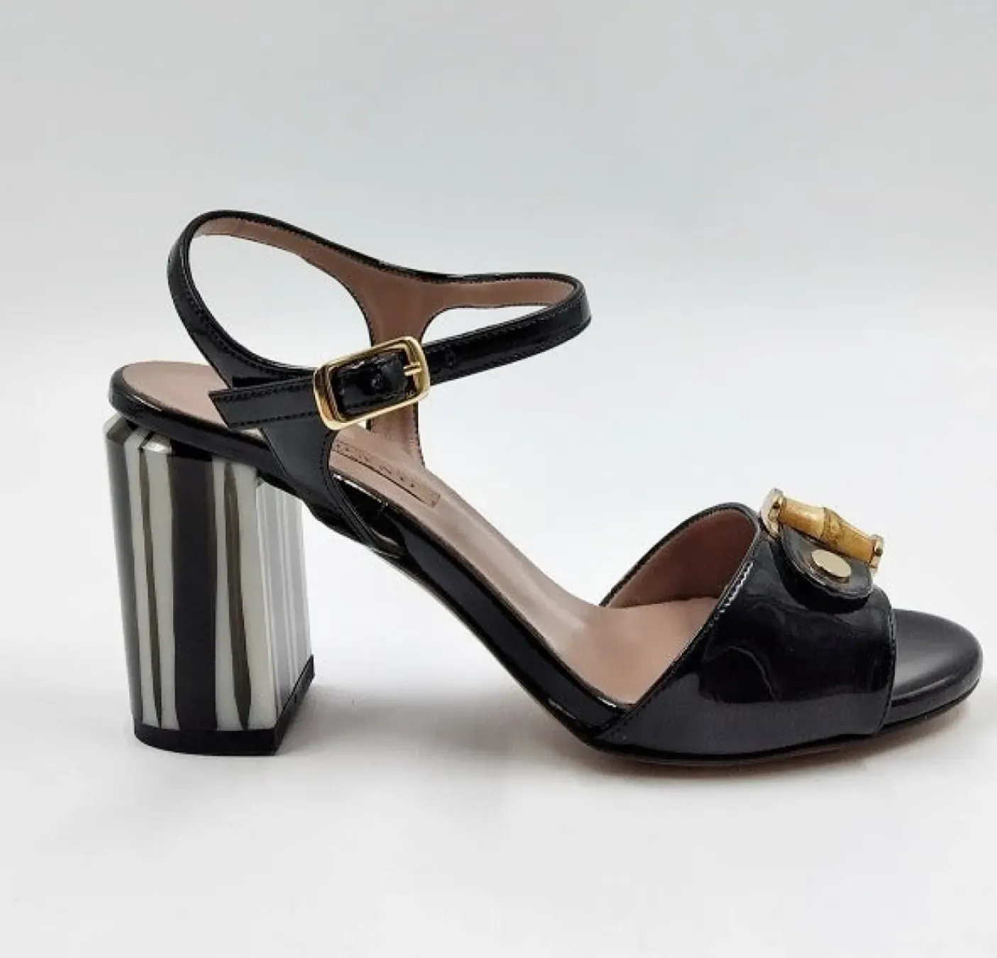 Sandalo in pelle con decorazione e tacco decorato. Sottopiede in pelle e suola in vero cuoio.