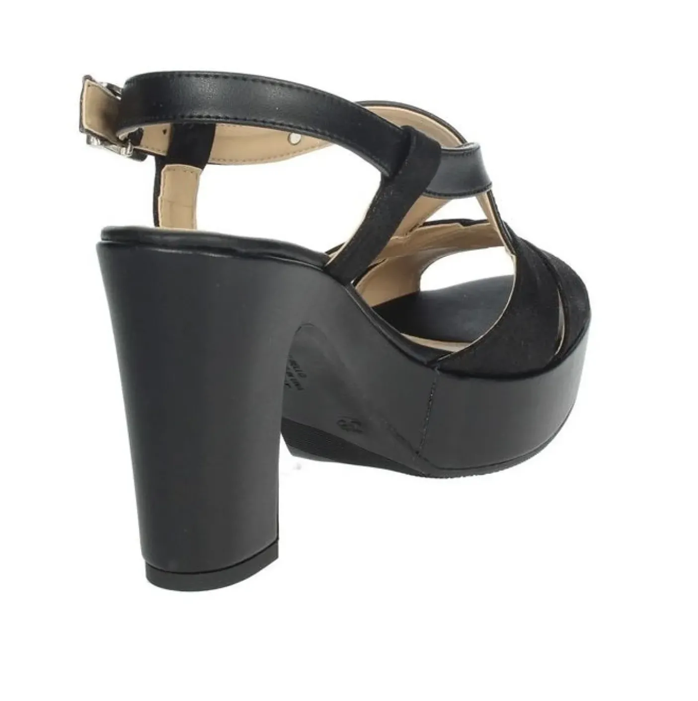 Sandali in ecopelle con fasce incrociate e chiusura con fibbia laterale. Tacco 9cm e plateau 3cm.