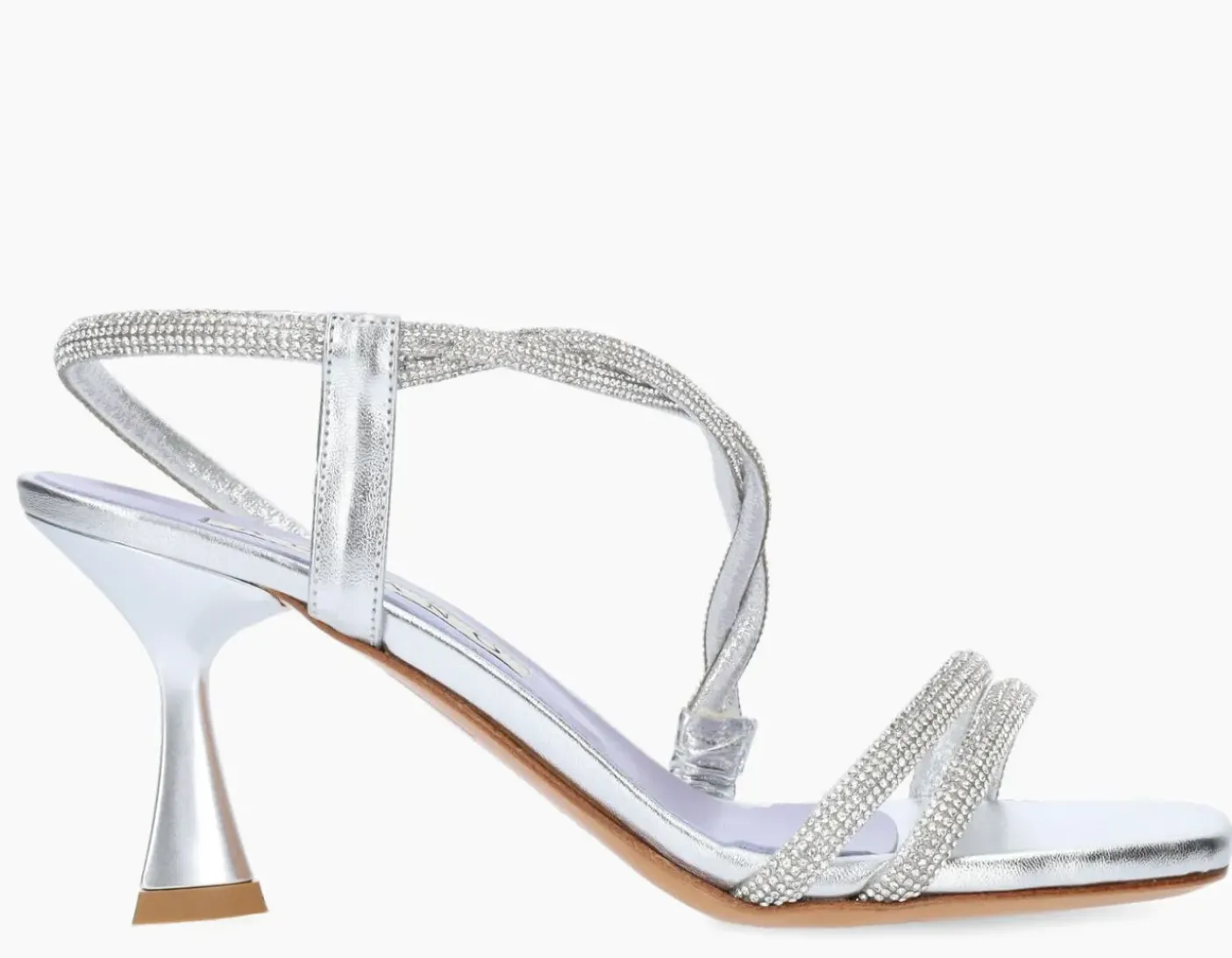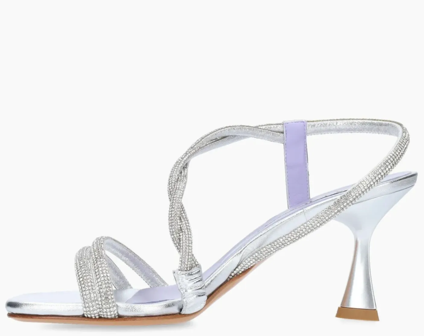 Sandali rivestiti internamente in pelle. Applicazione strass e decorazione intreccio strass. Soletta in pelle. Tacco 7cm
