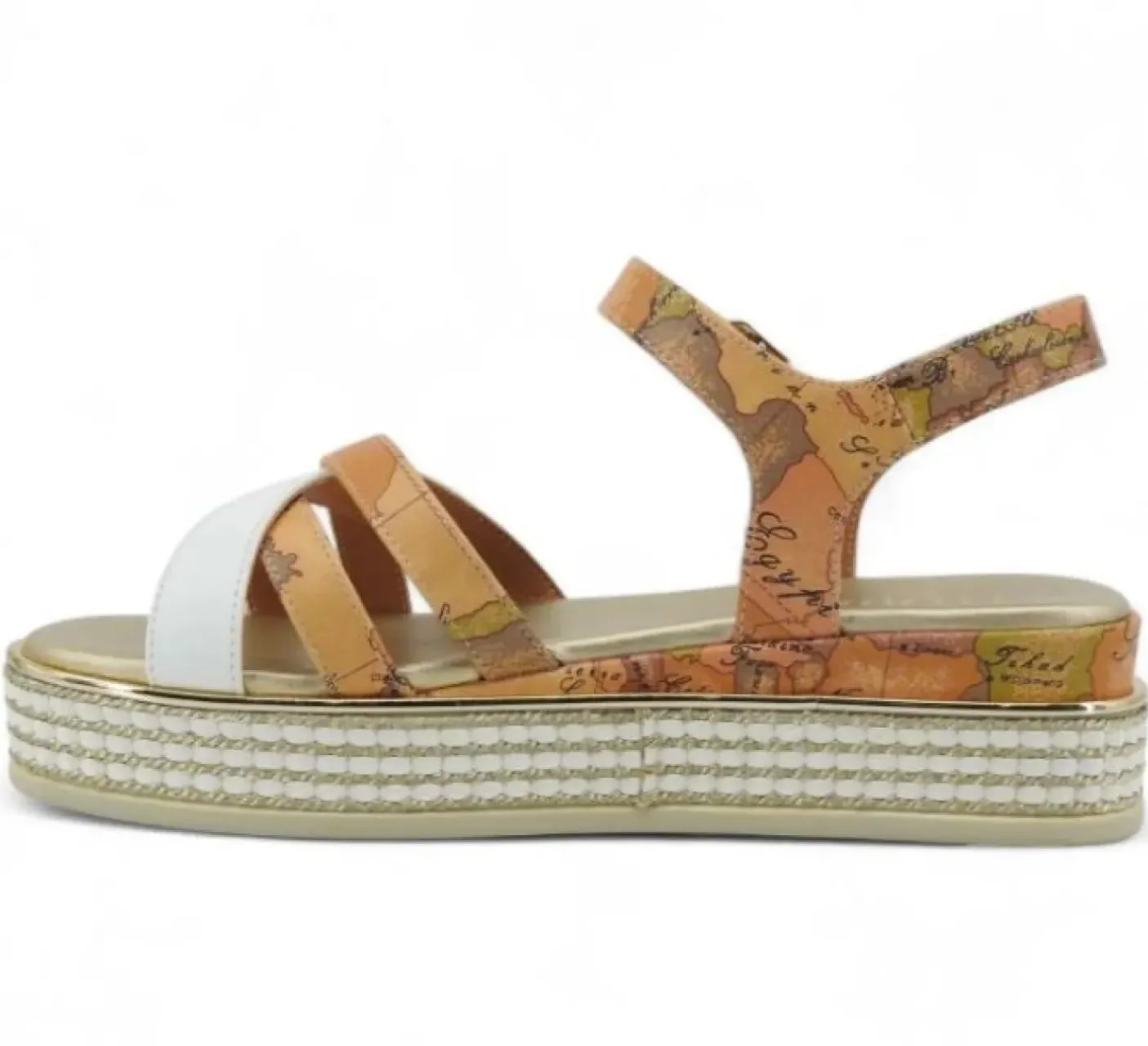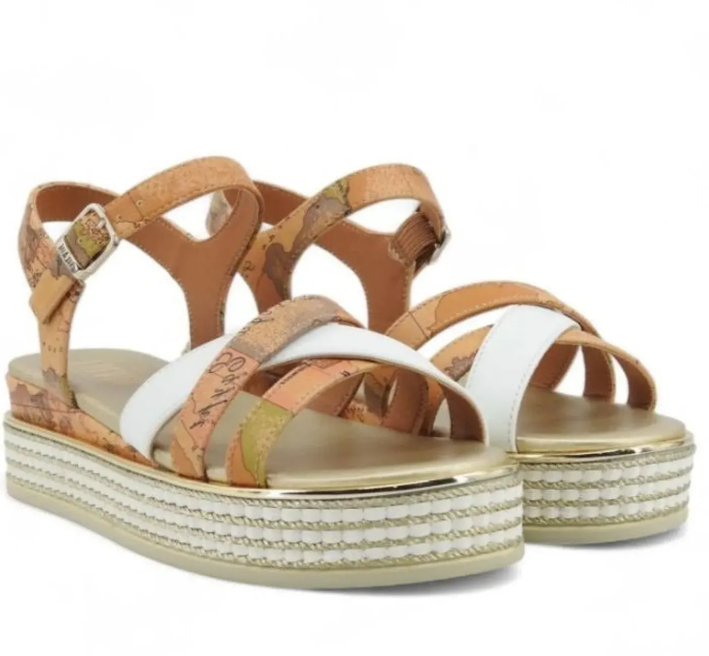 Sandalo con fasce con stampa geo classic e fascia bianca. Suola con stampa geo classic e dettaglio platinato in rafia. Cinturino incrociato con logo su fibbia regolabile. Fondo 4,5 cm. Tomaia in ecopelle, interno in ecopelle e suola in gomma.