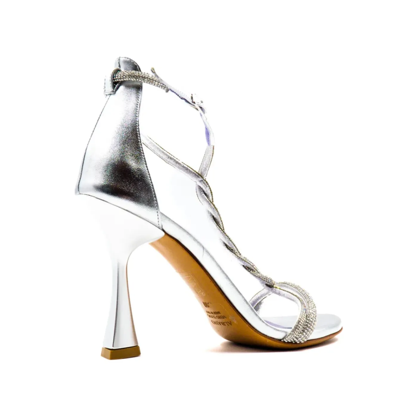 Sandalo con applicazione treccia strass. Rivestito internamente in pelle. Soletta in pelle. Cinturino regolabile alla caviglia. Fortino alto. Suola in cuoio. Tacco 10cm
