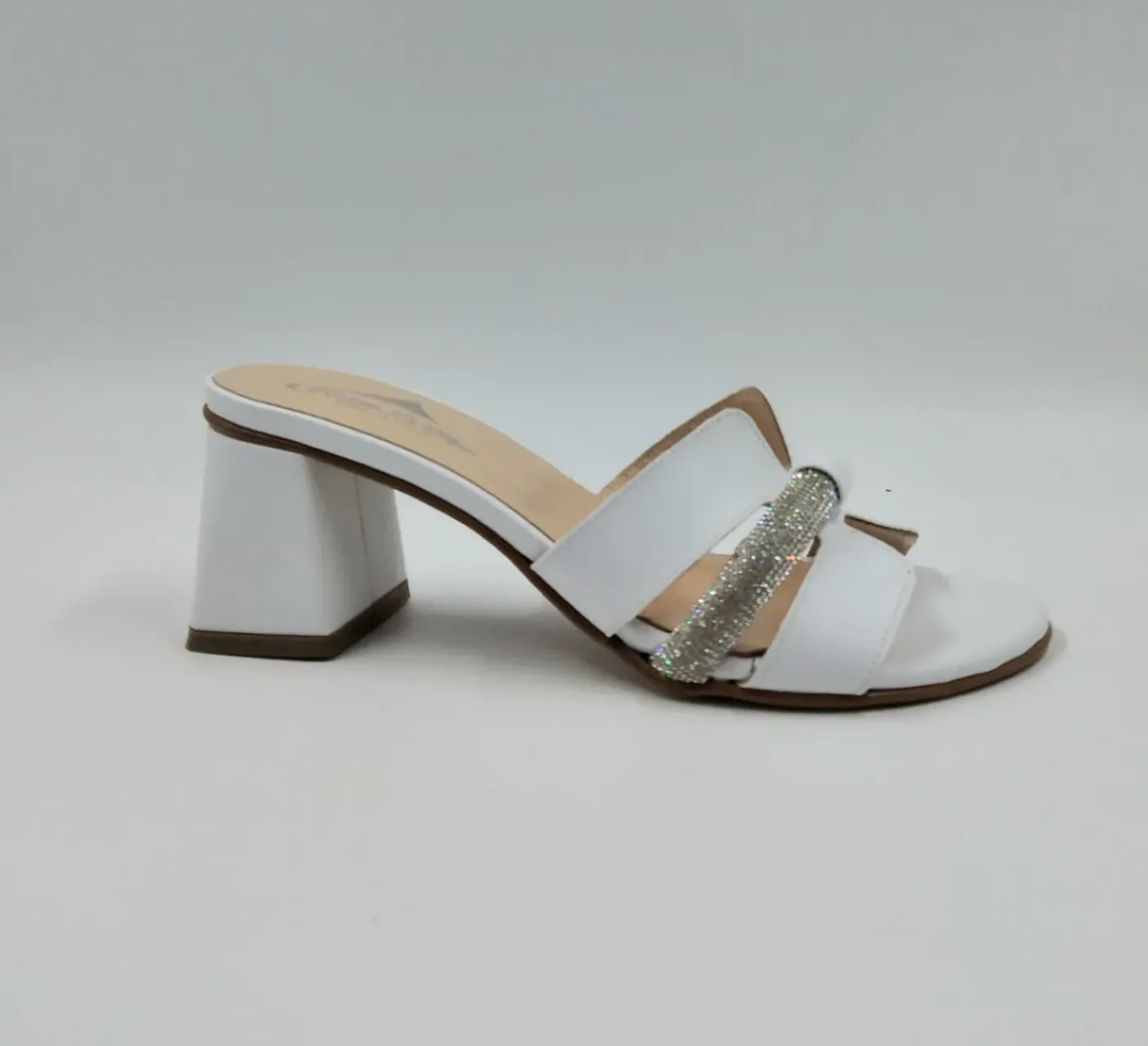 Sandali scalzati bianchi con applicazioni strass. Soletta in pelle. Tacco squadrato 5cm