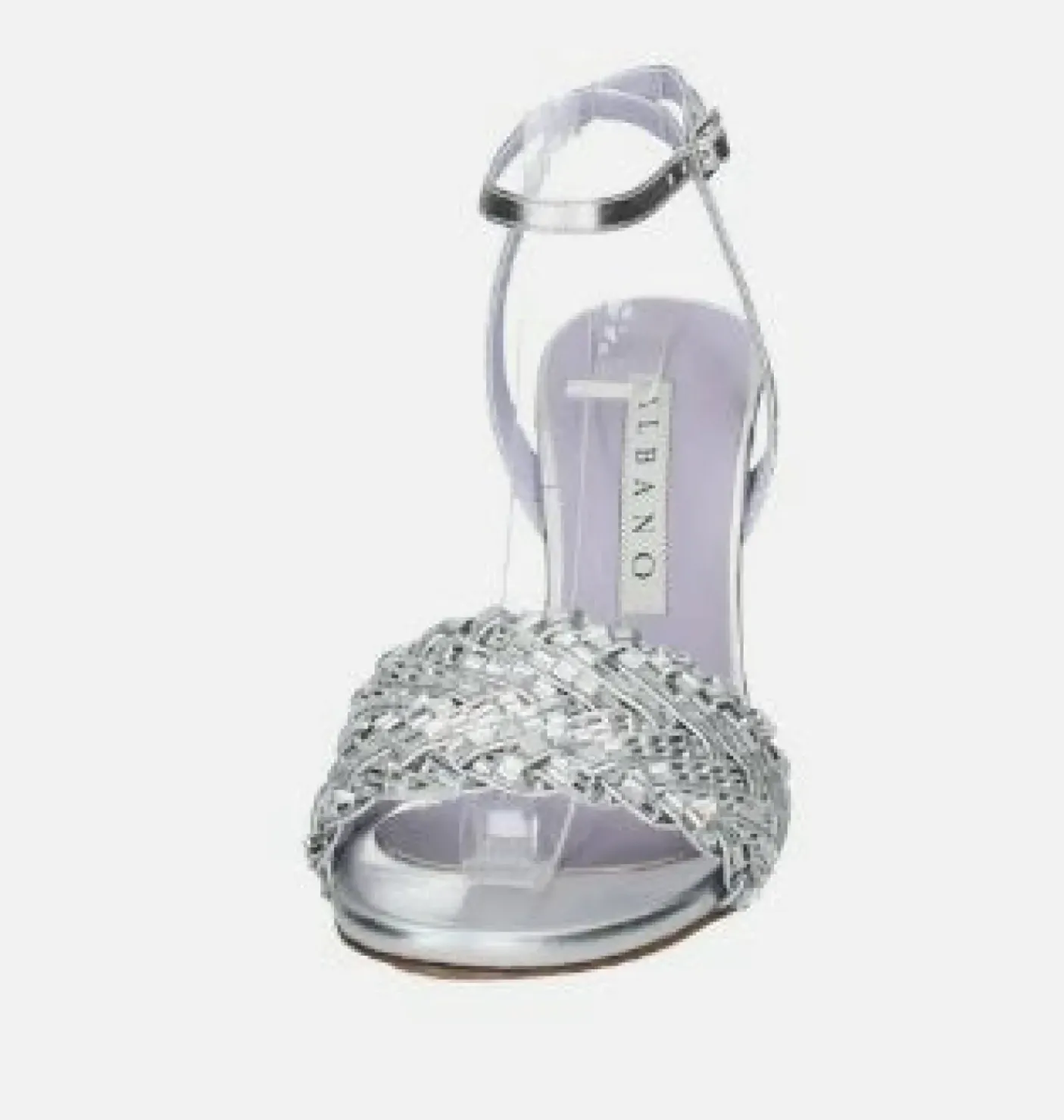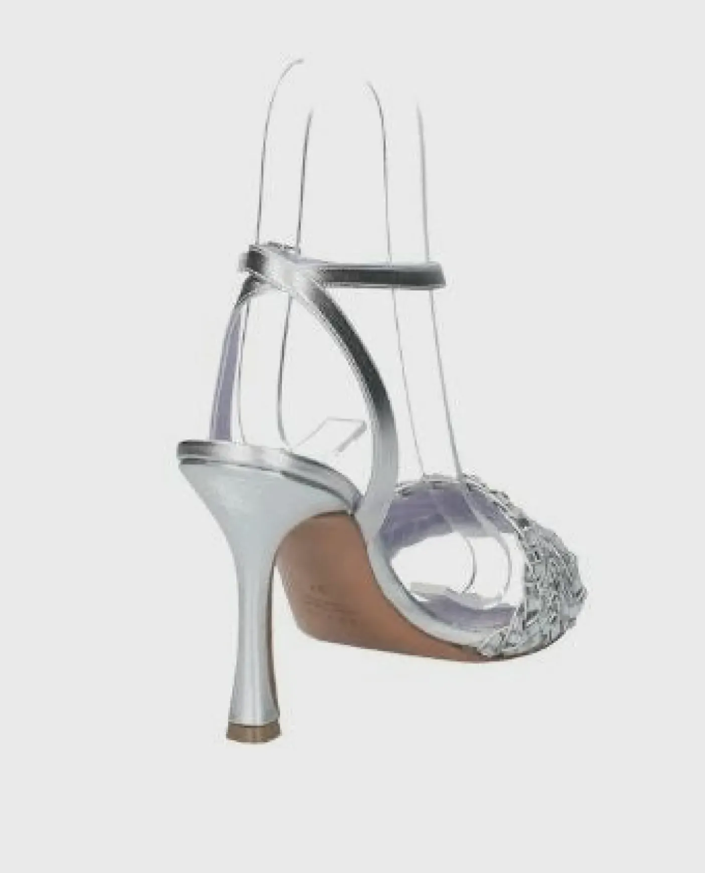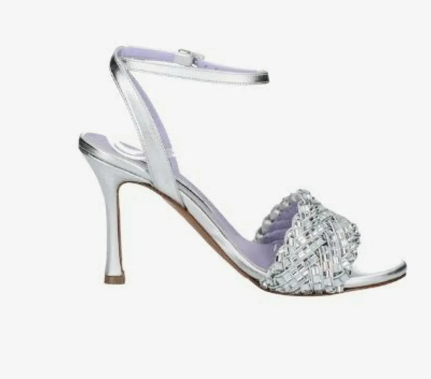 Sandali fascia multi strass rettangolari. Rivestito internamente in pelle. Soletta in pelle. Chiusura regolabile. Fondo cuoio, tacco 10cm