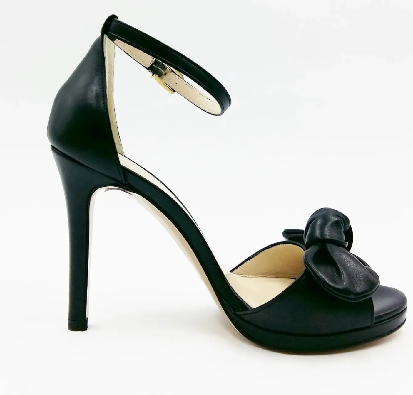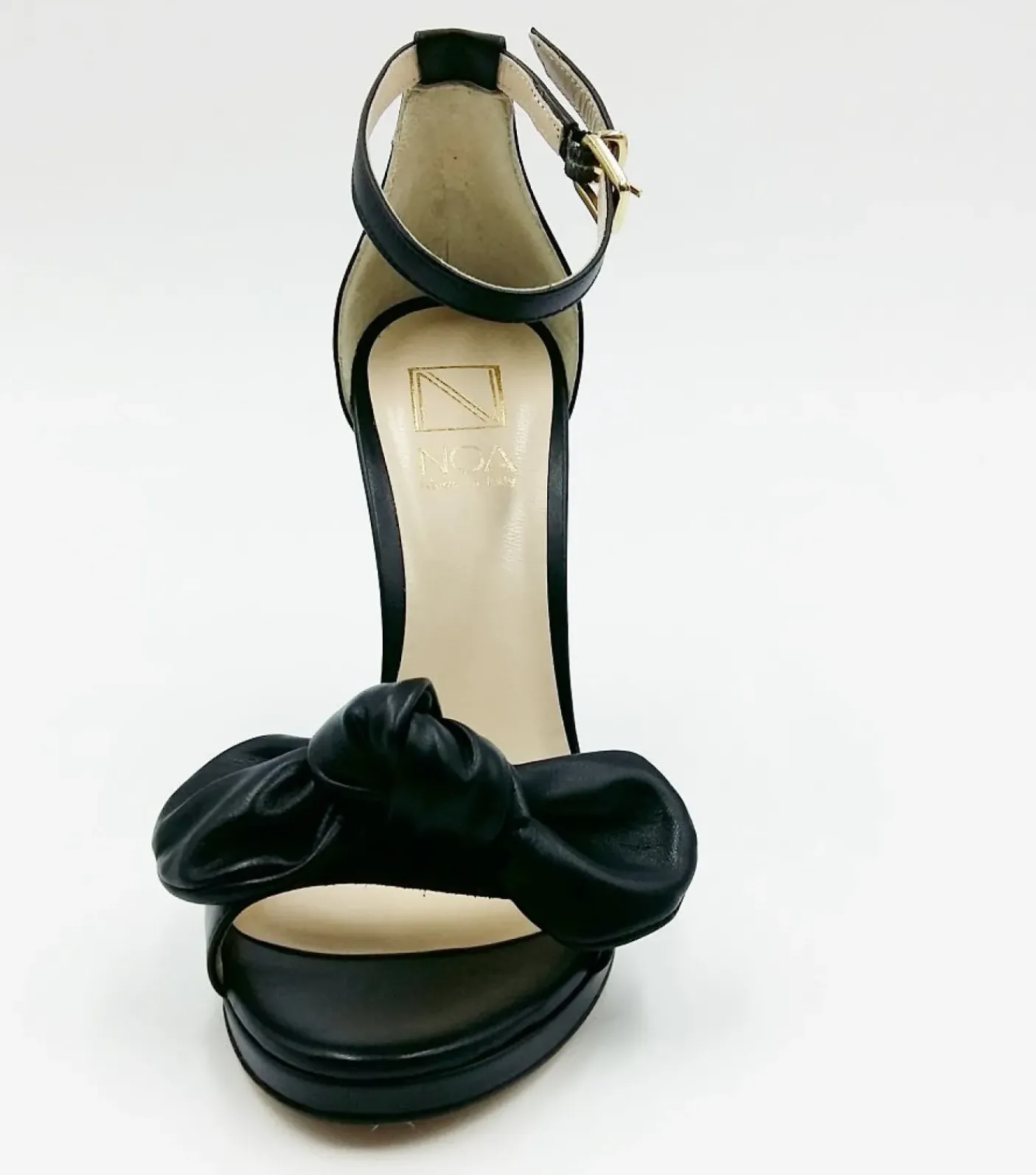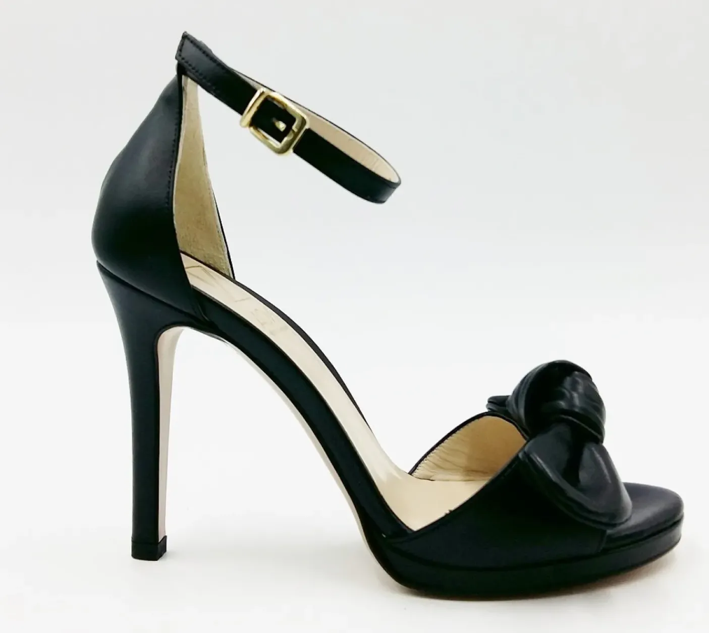 Sandalo in pelle nera morbida, rivestito interamente in pelle. Decorazione con fiocco in pelle. Cinturino con fibbia alla caviglia. Tacco rivestito in pelle 12 cm. Fondo in vero cuoio.