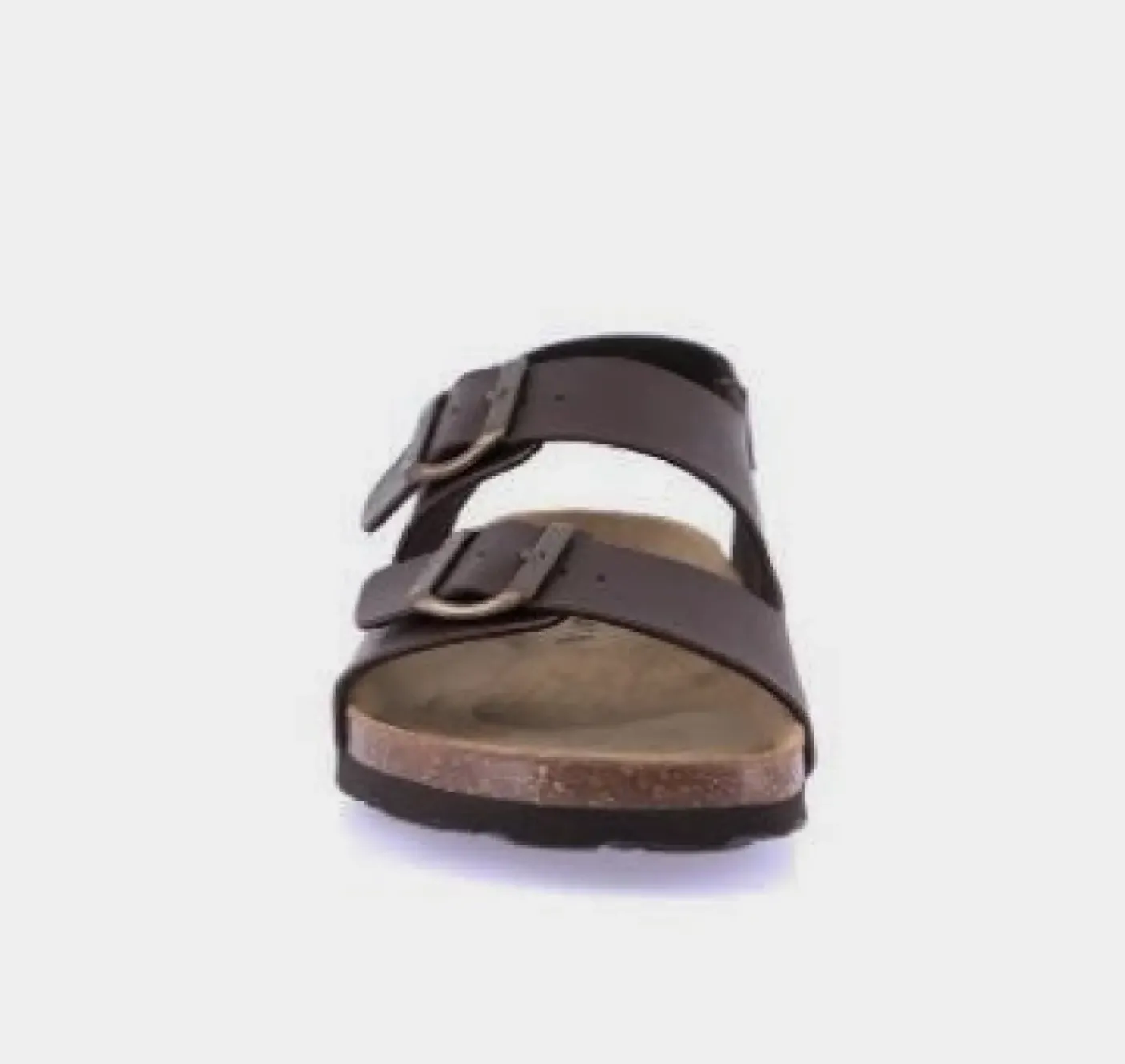 Sandalo in ecopelle realizzata con materiali di riciclo. Plantare anatomico in sughero naturale ricoperto in vera pelle. Fondo gomma. Chiusura con fibbie regolabili.