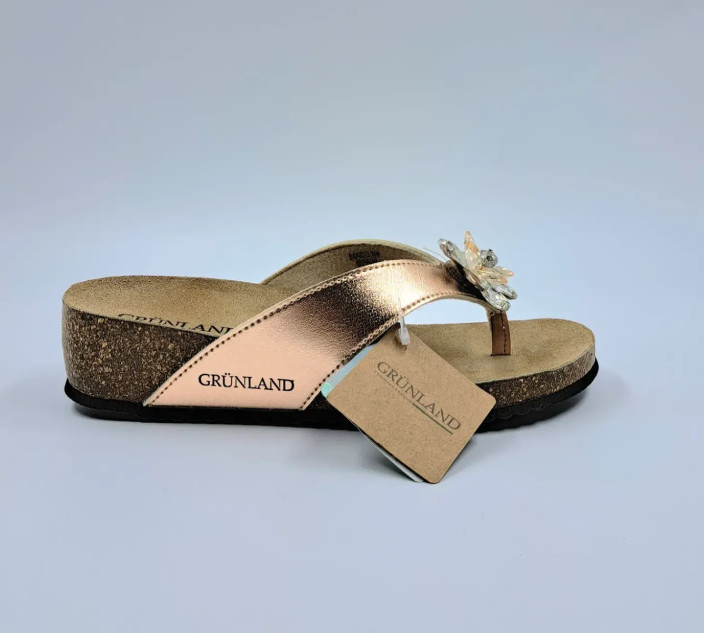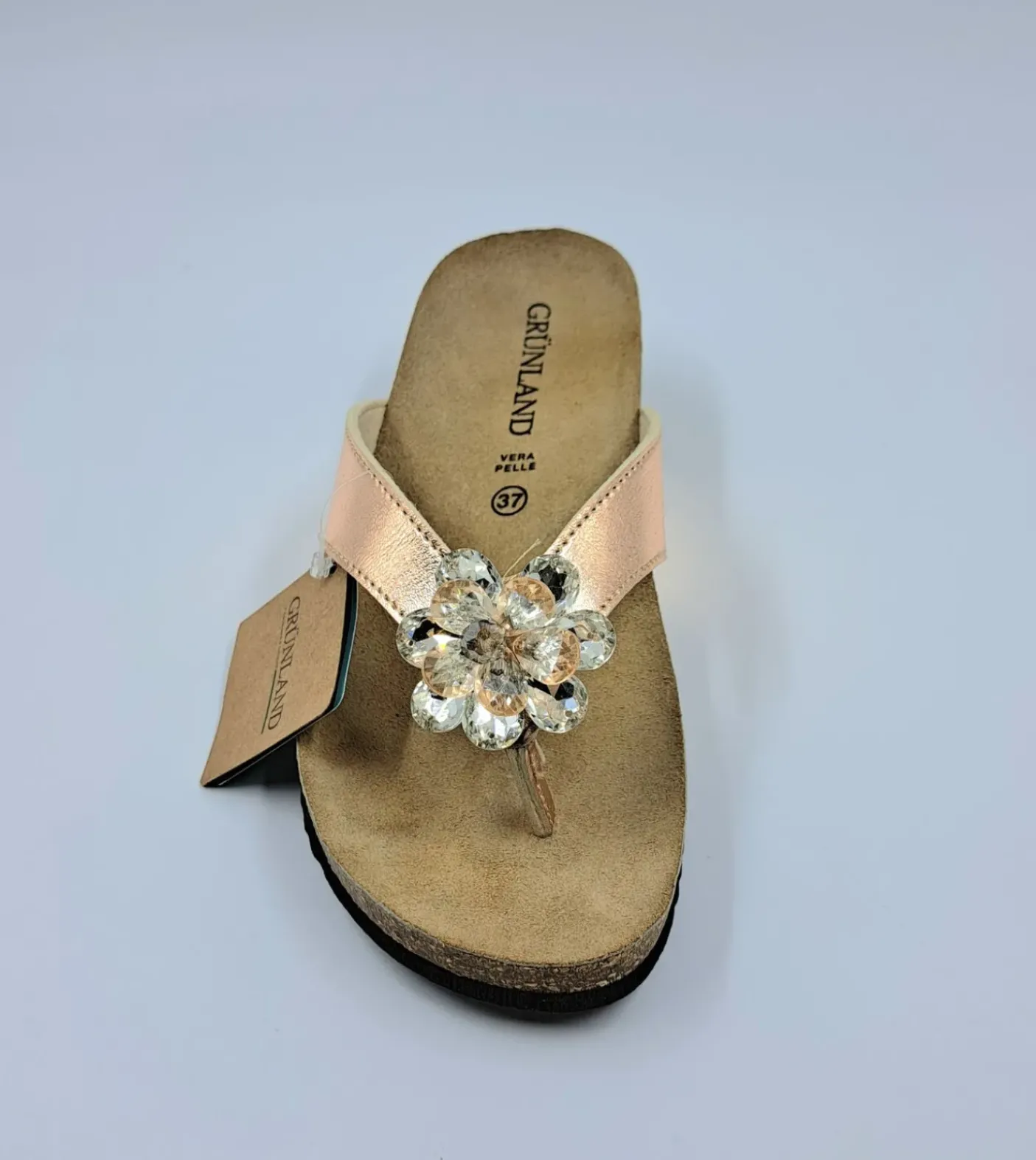 Sandalo infradito con plantare in mescola di lattice e sughero naturale. Materiale ecopelle impreziosito con pietre bianche fiore. Suola anatomica antisdrucciolo in microporosa. Altamente ammortizzante, leggera e flessibile 4 cm.